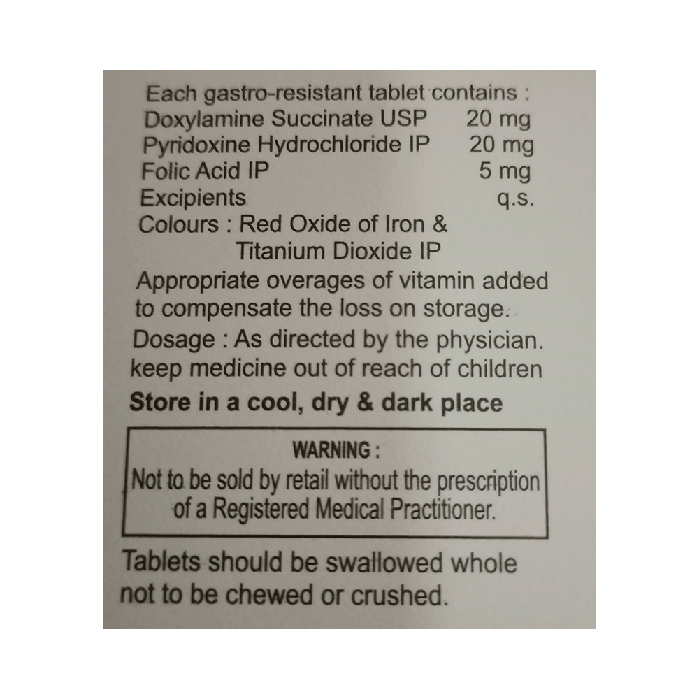 Salt Composition: Doxylamine (20mg) + Vitamin B6 (Pyridoxine) (20mg) + Folic Acid (5mg)