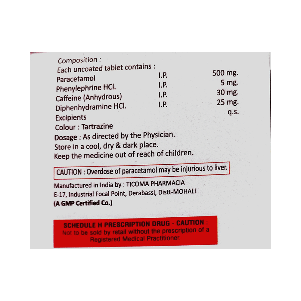Salt Composition: Caffeine (30mg) + Diphenhydramine (25mg) + Paracetamol (500mg) + Phenylephrine (5mg)