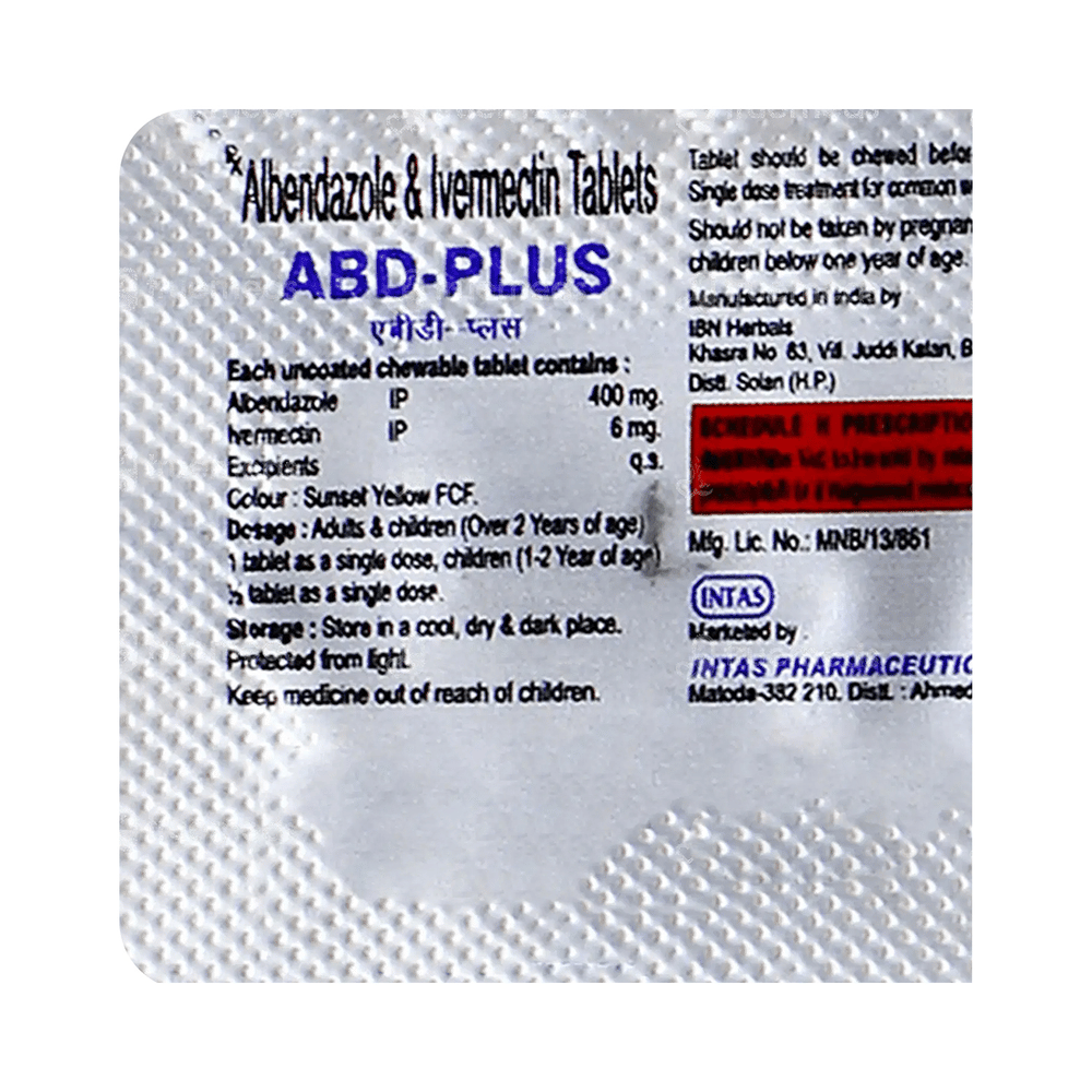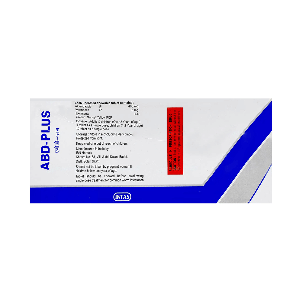 Abd Plus Tablet is a combination medicine that is used in the treatment of parasites and worm infestations in the body. It fights against the worms to treat the infection. Abd Plus Tablet is a prescription medicine. It is advised to take it as per the prescription. It can be taken with or without food, but it must be taken at a fixed time to ensure better efficacy. Do not consume more than the recommended dose, as this may have harmful effects on your body. If you miss a dose, take it as soon as you remember. The course of the treatment must be completed even if you feel better. Sudden discontinuation of the treatment may affect the potency of the medicine.Some common side effects of this medicine are nausea, vomiting, diarrhea, flatulence, etc. If any of the side effects get aggravated, you must consult your doctor immediately. If you experience any allergic reaction (rashes, itching, swelling, shortness of breath, etc.), you must seek immediate medical help.Before taking this medicine, you should tell your doctor if you are taking any medicines for any health condition. Pregnant or breastfeeding women should also consult with their doctor before taking it. Avoid drinking alcohol as it can cause excessive drowsiness with this medicine. It usually does not impair your ability to drive, but you should not drive if it makes you feel sleepy or dizzy. You must take adequate rest for a faster recovery, also take a healthy diet and drink plenty of water. Your doctor may ask for a few laboratory and diagnostic tests to know the effects of the medicine on your body.