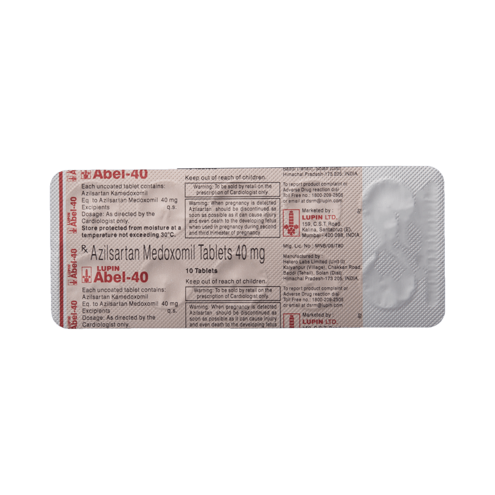 Abel 40 Tablet is a medicine used to treat high blood pressure and heart failure. Lowering blood pressure helps to prevent future heart attack and stroke. This medicine is also effective in preserving kidney function in patients with diabetes. Abel 40 Tablet can be prescribed either alone or in combination with other medicines. It may be taken with or without food during the day or at night. However, try to take it at the same time each day to get the most benefit. It is important to continue taking it regularly even if you feel well or if your blood pressure is controlled. Most people with high blood pressure do not feel ill, but if you stop taking this medicine, your condition could get worse. This is a widely used medicine and is considered safe for long-term use.Making some changes in your lifestyle will also help lower your blood pressure. These may include regular exercise, losing weight, smoking cessation, reducing alcohol intake, and reducing the amount of salt in your diet as advised by your doctor. This medicine is tolerated well by most patients and has few side effects. Dizziness, particularly after the first dose, is known to occur in some people. This may be associated with headache. Let your doctor know if these side effects bother you or do not go away. No weight gain has been seen with the regular use of this medicine.Before taking this medicine, let your doctor know if you have any kidney or liver problems. Pregnant or breastfeeding mothers should also consult their doctor before taking it. Your doctor may check your kidney function, blood pressure, and potassium levels in your blood at regular intervals while you are taking this medicine.