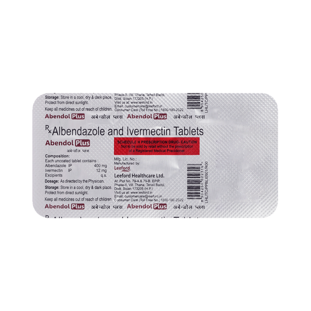 Abendol Plus 12mg/400mg Tablet is a combination medicine that is used in the treatment of parasites and worm infestations in the body. It fights against the worms to treat the infection. Abendol Plus 12mg/400mg Tablet is a prescription medicine. It is advised to take it as per the prescription. It can be taken with or without food, but it must be taken at a fixed time to ensure better efficacy. Do not consume more than the recommended dose, as this may have harmful effects on your body. If you miss a dose, take it as soon as you remember. The course of the treatment must be completed even if you feel better. Sudden discontinuation of the treatment may affect the potency of the medicine.Some common side effects of this medicine are nausea, vomiting, diarrhea, flatulence, etc. If any of the side effects get aggravated, you must consult your doctor immediately. If you experience any allergic reaction (rashes, itching, swelling, shortness of breath, etc.), you must seek immediate medical help.Before taking this medicine, you should tell your doctor if you are taking any medicines for any health condition. Pregnant or breastfeeding women should also consult with their doctor before taking it. Avoid drinking alcohol as it can cause excessive drowsiness with this medicine. It usually does not impair your ability to drive, but you should not drive if it makes you feel sleepy or dizzy. You must take adequate rest for a faster recovery, also take a healthy diet and drink plenty of water. Your doctor may ask for a few laboratory and diagnostic tests to know the effects of the medicine on your body.