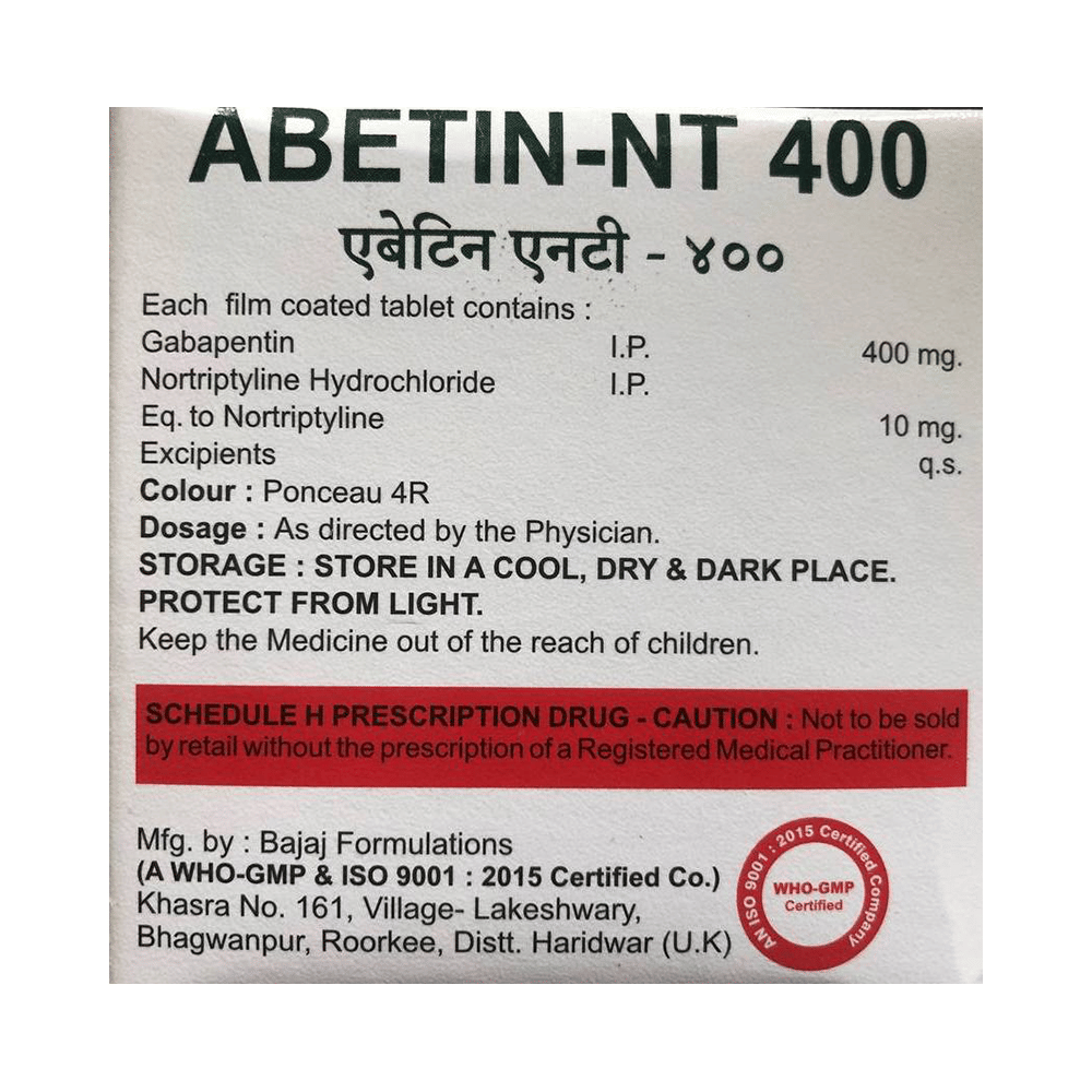 Abetin-NT 400 Tablet is a combination medicine used for the treatment of neuropathic pain. This medicine decreases the pain by stopping the movement of pain signals to the brain. Abetin-NT 400 Tablet is taken by mouth, with or without food and preferably at night. It is advised to take it at a fixed time each day to maintain a consistent level of medicine in the blood. In case you miss a dose of this medicine, take it as soon as you remember. Finish the full course of treatment even if you feel better. It is important not to stop taking this medicine suddenly without talking to the doctor as it may worsen your symptoms.Some common side effects of this medicine constipation, difficulty in urination, weight gain, tiredness, and dryness in mouth. It may also cause dizziness and sleepiness, so do not drive or do anything that requires mental focus until you know how this medicine affects you. This medicine may cause weight gain and to control it, you should exercise regularly and take a balanced diet. Remember to inform the doctor if you develop any unusual changes in mood as this medicine may lead to suicidal thoughts.Before taking this medicine let your doctor know if you suffer from kidney or liver disease. Your doctor should also know about all other medicines you are taking as many of these may make this medicine less effective or change the way it works. Inform your doctor if you are pregnant, planning pregnancy or breastfeeding.