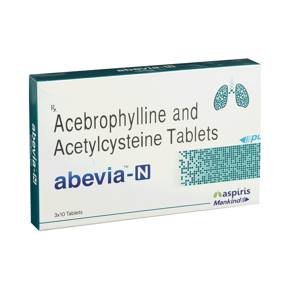 Abevia-N Tablet is a combination of two medicines: Acebrophylline and Acetylcysteine. Acebrophylline is a mucolytic and bronchodilator. It works by relaxing the muscles of the airways and also thins and loosens mucus, making it easier to breathe. Acetylcysteine is a mucolytic medication. It thins and loosens mucus (phlegm), making it easier to cough out.