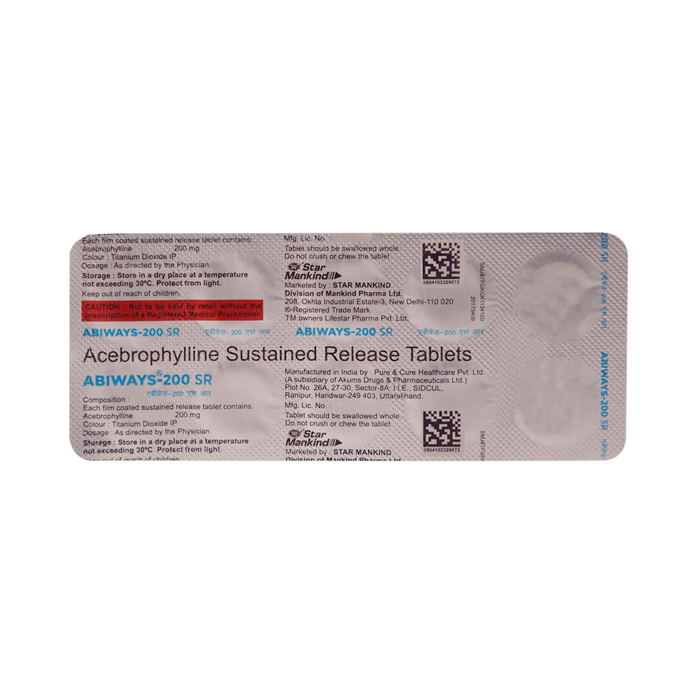 Abiways 200 SR Tablet is used to treat and prevent symptoms of asthma, bronchitis, and chronic obstructive pulmonary disorder (a lung disorder in which airflow to the lung is blocked). It helps relax the muscles of the air passages, thus widening them and making them easier to breathe. Abiways 200 SR Tablet can be taken with the food in the evening. Take it at the same time every day to get the most benefit. The dose and how often you take it depends on what you take it for. Your doctor will decide how much you need to improve your symptoms. Take this medicine for as long as it is prescribed for you. Do not miss even a single dose. If missed, take it as soon as you remember, or skip the missed dose and continue with regular dosing if it's almost time for the next dose. It does not work immediately or prevent the already-started breathing trouble; hence, always carry your medical inhaler for an emergency.The most common side effects of this medicine include abdominal discomfort, abdominal distension, vomiting, abdominal pain, diarrhea, constipation, and heartburn. If these bother you or appear serious, let your doctor know. There may be ways of reducing or preventing them. Generally, it is advised not to consume alcohol or do not smoke while on treatment.Before taking this medicine, tell your doctor if you have kidney, liver, or heart-related disease. Your doctor should also know about all other medicines you are taking, as many may make this medicine less effective or change its effect. Before starting the treatment, inform your doctor if you are pregnant or breastfeeding.