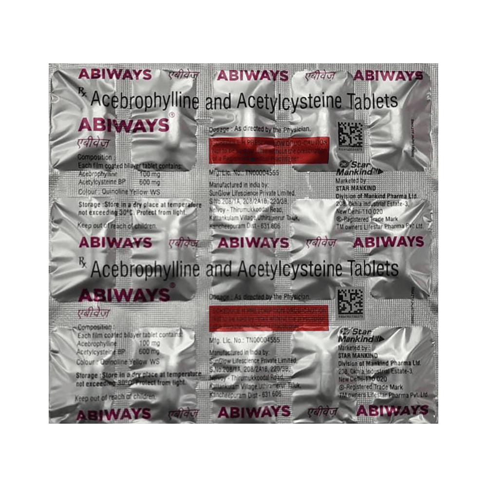 Abiways Tablet is a combination of two medicines: Acebrophylline and Acetylcysteine. Acebrophylline is a mucolytic and bronchodilator. It works by relaxing the muscles of the airways and also thins and loosens mucus, making it easier to breathe. Acetylcysteine is a mucolytic medication. It thins and loosens mucus (phlegm), making it easier to cough out.