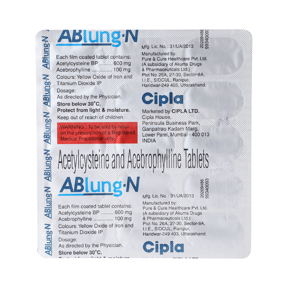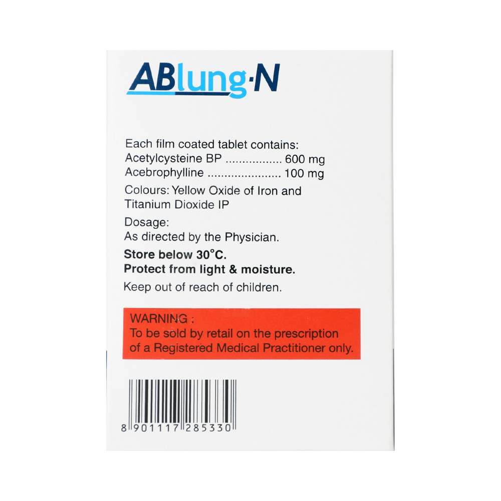Ablung N Tablet is used to treat and prevent asthma, symptoms of chronic obstructive pulmonary disorder, bronchitis, and complications of pulmonary cystic fibrosis. It helps relax the muscles of the air passages, thereby making it easier to breathe. Ablung N Tablet is taken with or without food in a dose and duration as advised by the doctor. The dose you are given will depend on your condition and how you respond to the medicine. You should keep taking this medicine for as long as your doctor recommends. If you stop treatment too early your symptoms may come back and your condition may worsen. Let your healthcare team know about all other medications you are taking as some may affect, or be affected by this medicine.The most common side effects are nausea, vomiting, headache, and dizziness. Most of these are temporary and usually resolve with time. Contact your doctor straight away if you are at all concerned about any of these side effects. Avoid drinking alcohol while taking this medicine as that may cause excessive drowsiness.Never support self-medication or recommend your medicine to another person. Before you start taking this medicine it is important to inform your doctor if you are suffering from liver or kidney disease. You should also tell your doctor if you are pregnant, planning pregnancy, or breastfeeding.
