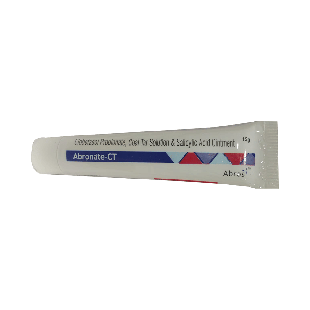 Abronate-CT Ointment is a combination of three medicines: Clobetasol, Salicylic Acid and Coal Tar which treat psoriasis. Clobetasol is a steroid medicine. It blocks the production of certain chemical messengers (prostaglandins) that make the skin red, swollen and itchy. Salicylic Acid and Coal Tar are keratolytic medicines which break down keratin clumps, remove dead skin cells and soften the skin.