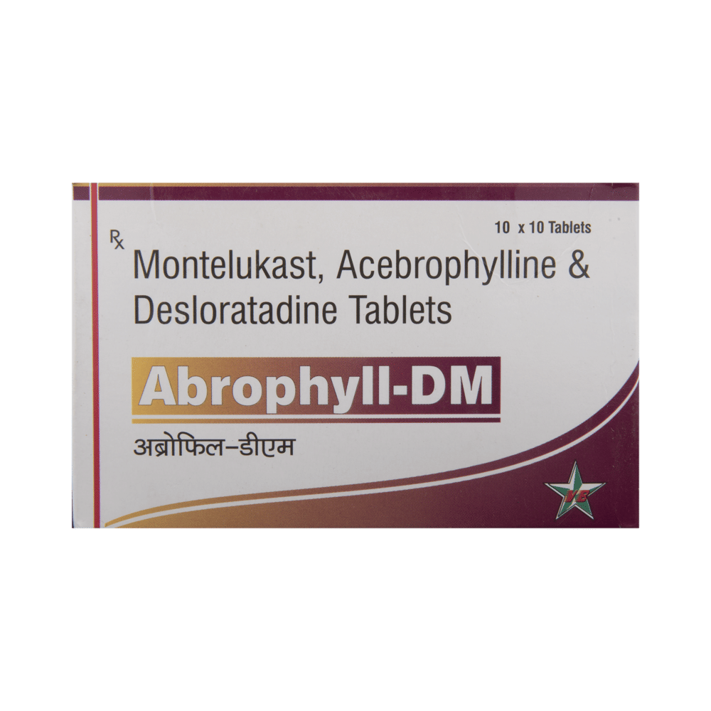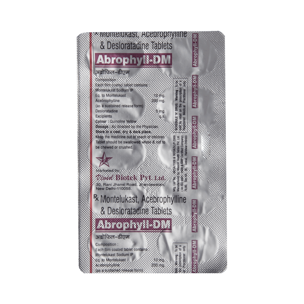 Abrophyll-DM Tablet is a combination of three medicines: Acebrophylline, Desloratadine and Montelukast. Acebrophylline is a mucolytic which thins and loosens mucus (phlegm), making it easier to cough out. Desloratadine is an antiallergic which relieves allergy symptoms like runny nose, watery eyes and sneezing. Montelukast is a leukotriene antagonist. It works by blocking the action of leukotriene, a chemical messenger. This reduces inflammation in the airways and nose and improves your symptoms.