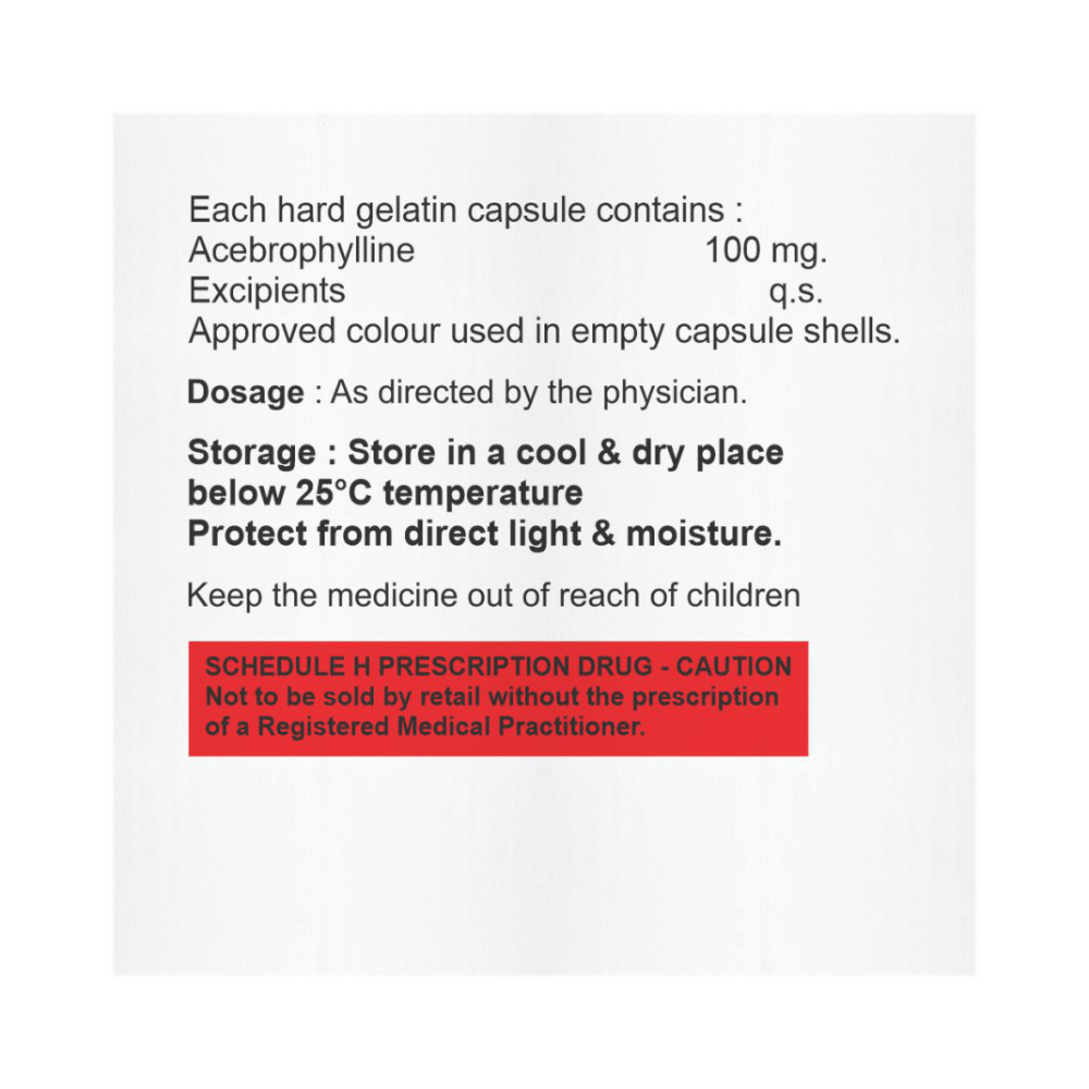 Abrovil 100mg Capsule is used to treat and prevent symptoms of asthma, bronchitis, and chronic obstructive pulmonary disorder (a lung disorder in which airflow to the lung is blocked). It helps relax the muscles of the air passages, thus widening them and making them easier to breathe. Abrovil 100mg Capsule can be taken with the food in the evening. Take it at the same time every day to get the most benefit. The dose and how often you take it depends on what you take it for. Your doctor will decide how much you need to improve your symptoms. Take this medicine for as long as it is prescribed for you. Do not miss even a single dose. If missed, take it as soon as you remember, or skip the missed dose and continue with regular dosing if it's almost time for the next dose. It does not work immediately or prevent the already-started breathing trouble; hence, always carry your medical inhaler for an emergency.The most common side effects of this medicine include abdominal discomfort, abdominal distension, vomiting, abdominal pain, diarrhea, constipation, and heartburn. If these bother you or appear serious, let your doctor know. There may be ways of reducing or preventing them. Generally, it is advised not to consume alcohol or do not smoke while on treatment.Before taking this medicine, tell your doctor if you have kidney, liver, or heart-related disease. Your doctor should also know about all other medicines you are taking, as many may make this medicine less effective or change its effect. Before starting the treatment, inform your doctor if you are pregnant or breastfeeding.