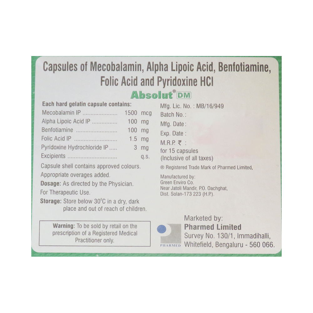 Absolut DM Capsule is a combination of vitamin and mineral supplements. Methylcobalamin corrects vitamin B12 deficiency thereby helping in treating certain anemias and nerve problems. Alpha-lipoic acid is an antioxidant that protects the brain and nerves from harmful free radicals. It lowers bad cholesterol. It breaks down carbohydrates to make energy. Folic acid is essential for production of red blood cells. It prevents and treats folate deficiency and anemia. Pyridoxine treats or prevents deficiency of vitamin B6 and improves functioning of nervous and immune systems. Benfotiamine treats vitamin B1 deficiency and resulting nerve damage.