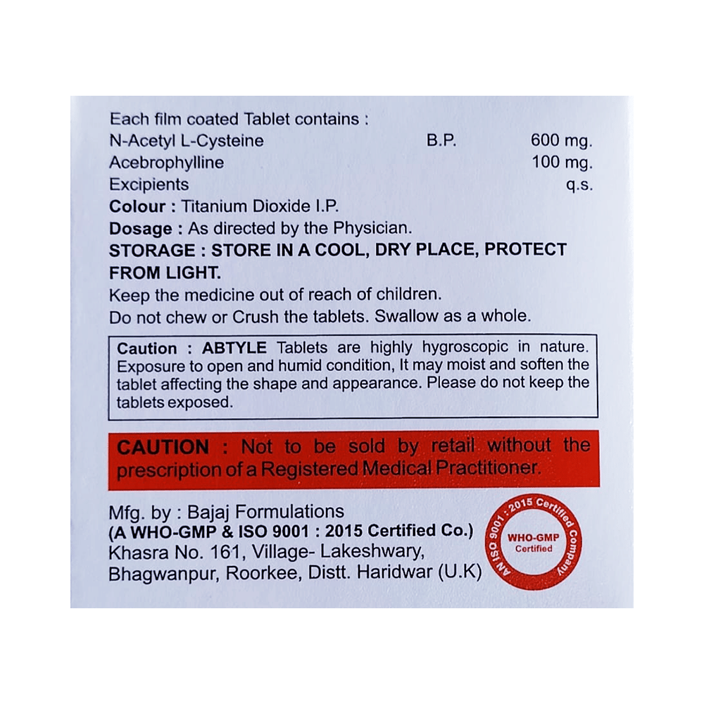 Abtyle Tablet is a combination of two medicines: Acebrophylline and Acetylcysteine. Acebrophylline is a mucolytic and bronchodilator. It works by relaxing the muscles of the airways and also thins and loosens mucus, making it easier to breathe. Acetylcysteine is a mucolytic medication. It thins and loosens mucus (phlegm), making it easier to cough out.