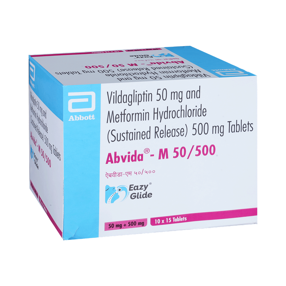 In Treatment of Type 2 diabetes mellitusAbvida-M 50/500 Eazy Glide Tablet SR is a combination of two medicines that work together in different ways to lower your blood glucose levels. Lowering blood glucose levels is an essential part of managing diabetes. If you can control your blood glucose level, your risk of getting any of the serious complications of diabetes such as kidney damage, eye damage, nerve problems, and loss of limbs is also lowered. Additionally, proper control of diabetes can also reduce the risk of heart disease and stroke. Taking this medicine regularly along with proper diet and exercise will help you live a normal, healthy life. You should keep using this medicine for as long as it is prescribed because it is protecting your future health.