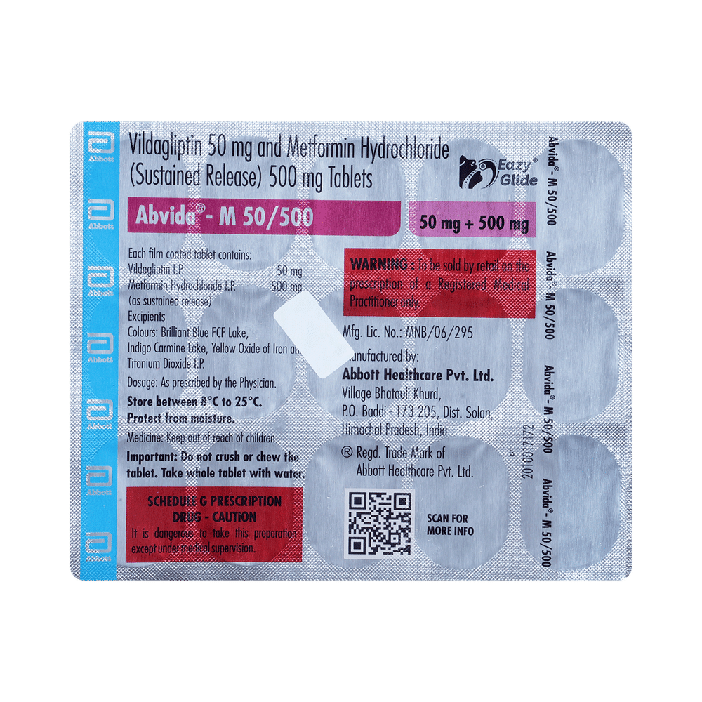 Abvida-M 50/500 Eazy Glide Tablet SR is a combination of two antidiabetic medicines: metformin and vildagliptin. Metformin is an anti-diabetic medication (biguanide). It works by lowering glucose production in the liver, delaying glucose absorption from the intestines, and increasing the body's sensitivity to insulin. Vildagliptin is a DPP-4 inhibitor that works by increasing the release of insulin from the pancreas and decreasing the hormones that raise blood sugar levels. This reduces both fasting and post-meal sugar levels. Together, they provide better control of blood sugar.