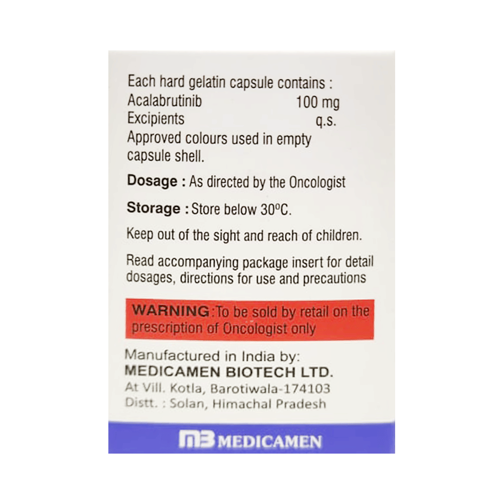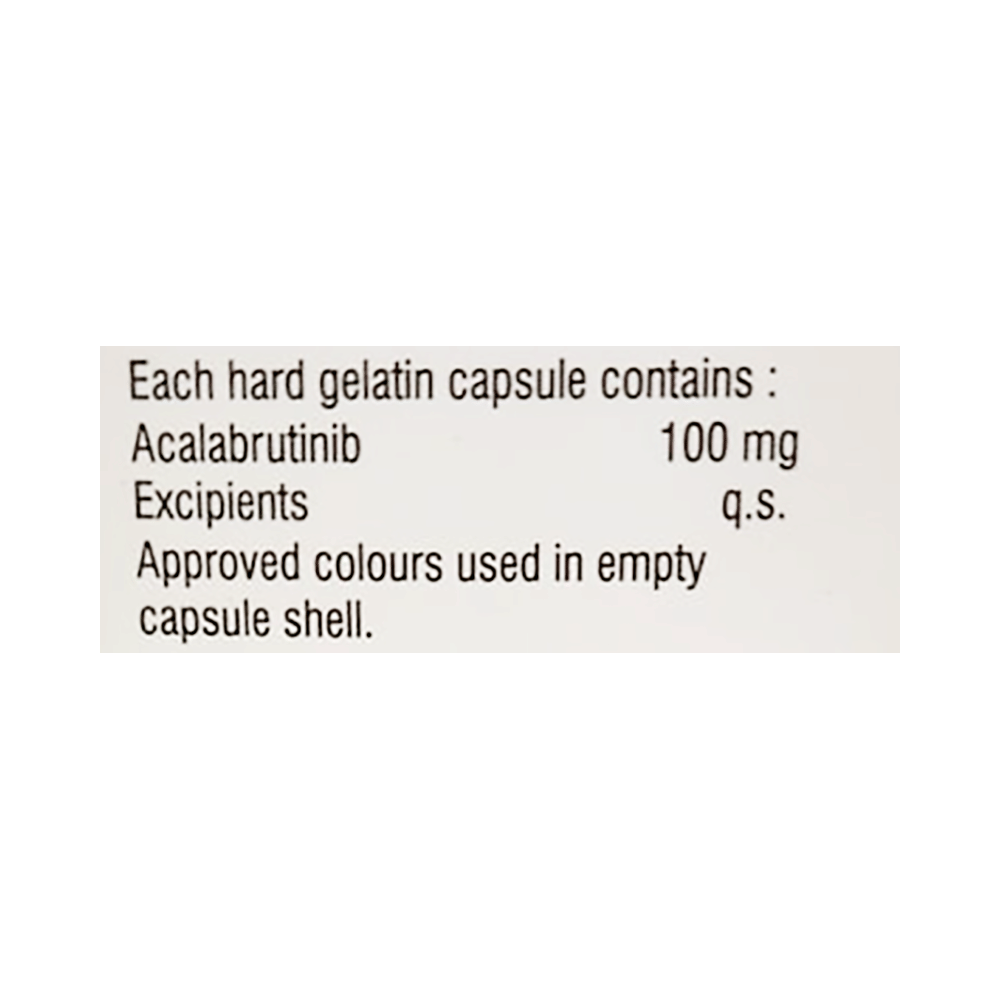 Acalamed Capsule is used in the treatment of blood cancer. It is given to patients aged more than 18 years who have received at least one prior treatment for their cancer. It is unknown if this drug is safe and effective in children. Acalamed Capsule is taken orally, preferably with food or between meals. It should be used in the dose and duration prescribed by your doctor. It is advised to take this medicine at a fixed time and for as long as the doctor prescribes to avoid missing a dose. It may take several weeks or months for you to see or feel the benefits.The most common side effects of Acalamed Capsule include anemia, neutropenia, upper respiratory tract infection, thrombocytopenia, headache, diarrhea, and musculoskeletal pain. If these bother you or appear serious, let your doctor know as they might suggest ways of reducing or preventing these side effects.Inform your doctor if you have a medical history of bleeding disorders, heart or liver disease, radiation treatment, or any infection. The risk of bleeding may increase if the patient is taking a blood thinner medicine along with Acalamed Capsule. Many other medicines can affect or be affected by this medicine, so let your doctor know of all the medications you are using. Inform the doctor immediately if unusual bruising or bleeding or dark, tarry, or bloody stools and sore throat are noticed.This medicine is known to reduce the number of blood cells in your blood, thereby increasing the susceptibility to infections. Regular blood tests are required to check the blood cell count along with the kidneys, liver, and heart functions during the treatment with this medicine. The use of effective contraception by both males and females during the treatment is important to avoid pregnancy.