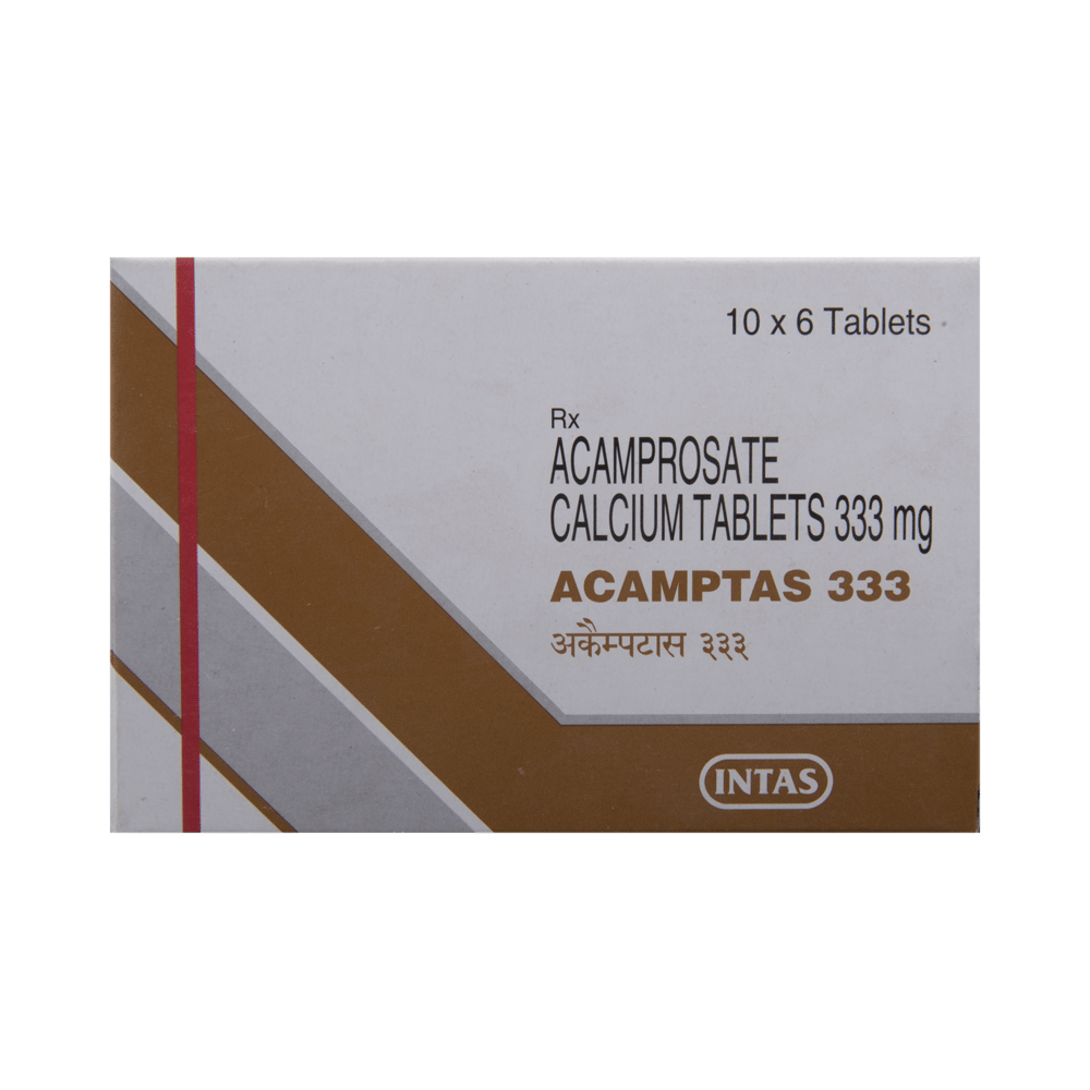 Acamptas 333 Tablet is a medicine that is used to stop cravings in people who have completely stopped drinking alcohol. However, this medicine does not treat alcohol withdrawal symptoms or prevent the harmful effects of alcohol abuse. Acamptas 333 Tablet should be taken with food. It is only effective when you have completely stopped drinking alcohol. If you miss a dose, take it as soon as you remember. Do not skip any doses; finish the entire course of treatment. Do not suddenly stop taking this medication without talking to your doctor.Some common side effects of using this medication are abdominal pain, nausea, vomiting, decreased libido, and itching. This medicine may cause diarrhea, so drink plenty of fluids to keep yourself hydrated while taking this medicine. Inform your doctor if you develop any unusual changes in mood or behavior, new or worsening depression, or suicidal thoughts or behavior.You should have regular counseling sessions, as it will provide extra help to maintain abstinence from alcohol. Remember, it will take time, support, willpower, and determination to readjust the habit of not drinking.