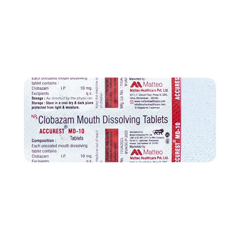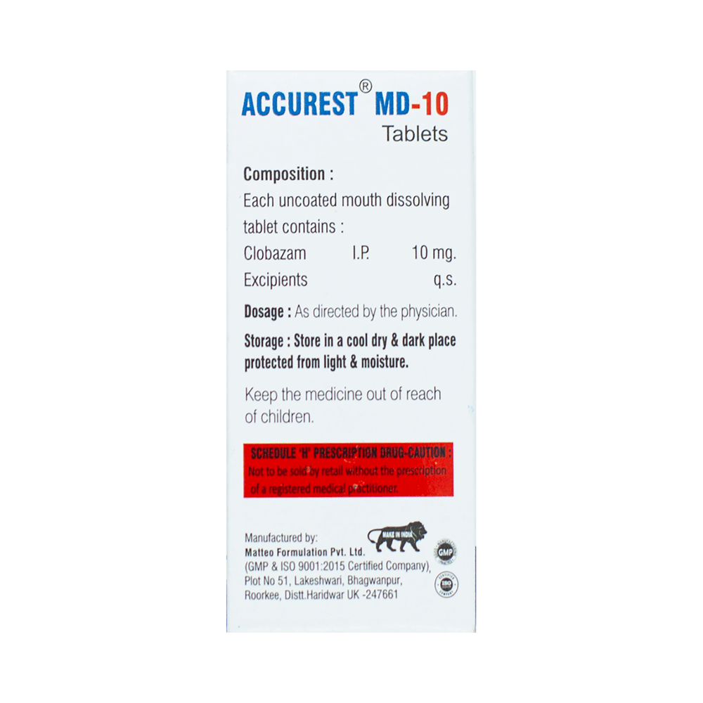 Accurest MD 10 Tablet belongs to a class of medicines known as benzodiazepines. It is used to treat epilepsy (seizures) and severe anxiety. It works by suppressing the abnormal and excessive activity of the nerve cells in the brain. Accurest MD 10 Tablet may be taken with or without food. However, it is advised to take it at the same time each day as this helps to maintain a consistent level of medicine in the body. Take this medicine in the dose and duration as advised by your doctor as it has a high potential of habit-forming.If you have missed a dose, take it as soon as you remember and finish the full course of treatment even if you feel better. It is important that this medication is not stopped suddenly without talking to your doctor as it may increase seizure frequency.Some common side effects of this medicine include tiredness, slurred speech, fever, cough, drooling, constipation, and difficulty in passing urine. It may cause dizziness and sleepiness, so do not drive or do anything that requires mental focus until you know how this medicine affects you. It is important to consult the doctor if you notice blisters on the skin or inside your mouth. If you have been taking this medicine for a long time then regular monitoring of blood and liver functions may be required.