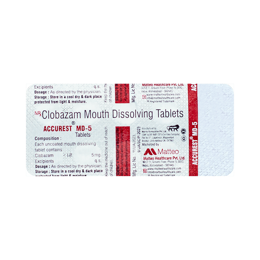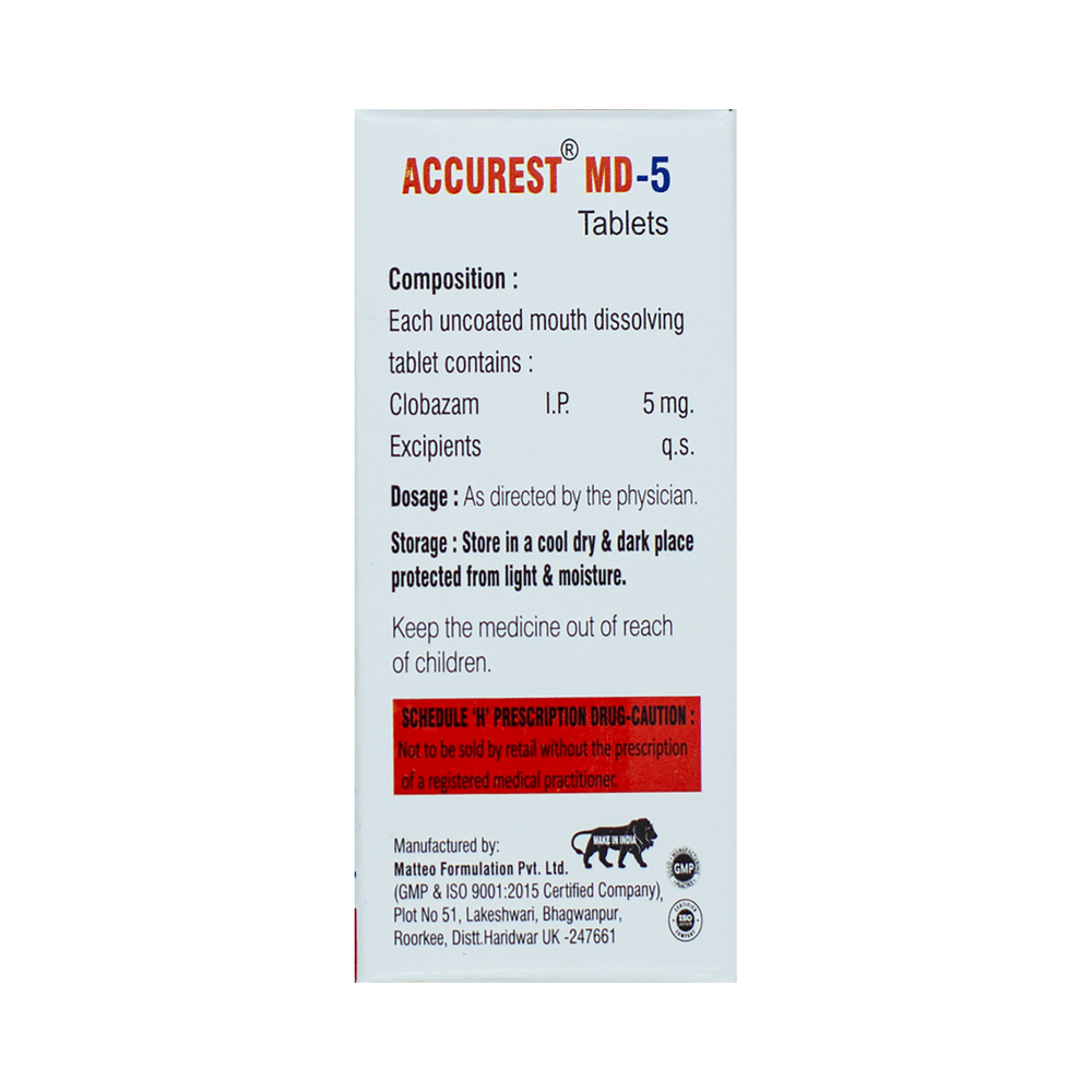 Accurest MD 5 Tablet belongs to a class of medicines known as benzodiazepines. It is used to treat epilepsy (seizures) and severe anxiety. It works by suppressing the abnormal and excessive activity of the nerve cells in the brain. Accurest MD 5 Tablet may be taken with or without food. However, it is advised to take it at the same time each day as this helps to maintain a consistent level of medicine in the body. Take this medicine in the dose and duration as advised by your doctor as it has a high potential of habit-forming.If you have missed a dose, take it as soon as you remember and finish the full course of treatment even if you feel better. It is important that this medication is not stopped suddenly without talking to your doctor as it may increase seizure frequency.Some common side effects of this medicine include tiredness, slurred speech, fever, cough, drooling, constipation, and difficulty in passing urine. It may cause dizziness and sleepiness, so do not drive or do anything that requires mental focus until you know how this medicine affects you. It is important to consult the doctor if you notice blisters on the skin or inside your mouth. If you have been taking this medicine for a long time then regular monitoring of blood and liver functions may be required.
