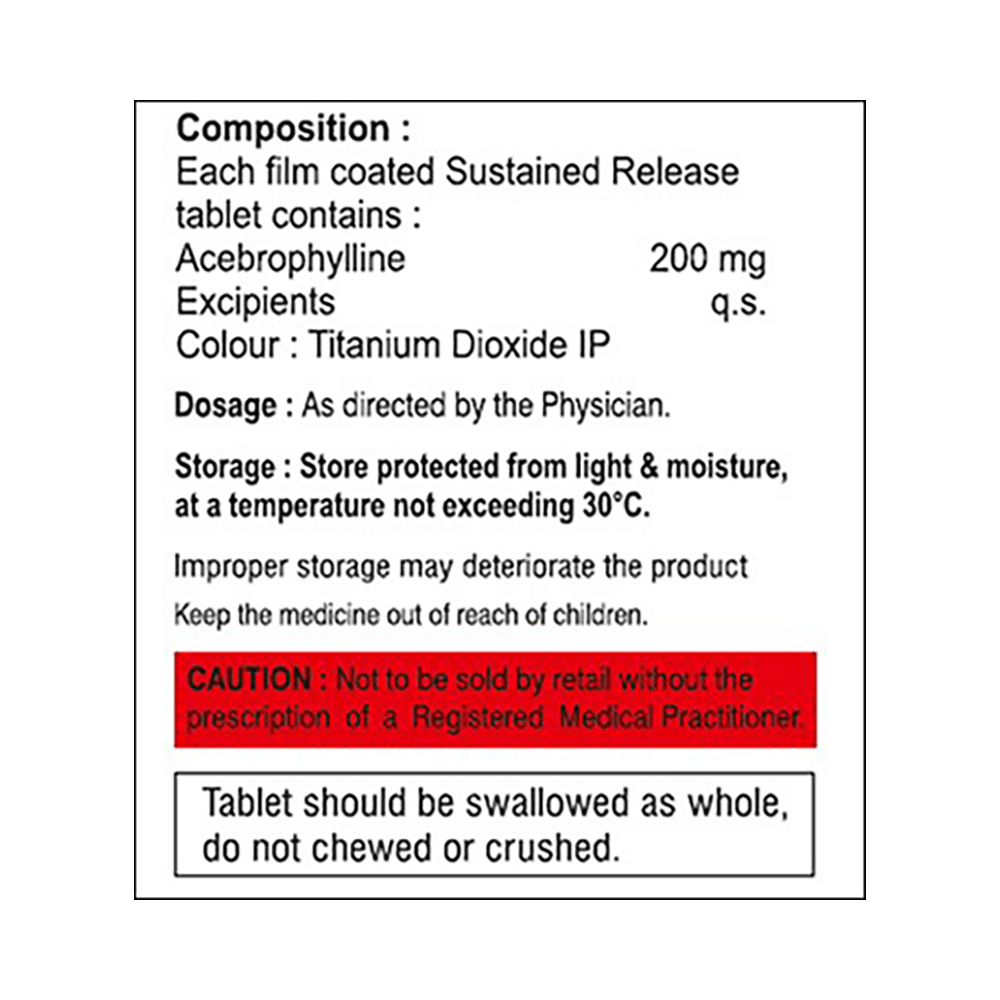 Acebraux SR 200 Tablet is used to treat and prevent symptoms of asthma, bronchitis, and chronic obstructive pulmonary disorder (a lung disorder in which airflow to the lung is blocked). It helps relax the muscles of the air passages, thus widening them and making them easier to breathe. Acebraux SR 200 Tablet can be taken with the food in the evening. Take it at the same time every day to get the most benefit. The dose and how often you take it depends on what you take it for. Your doctor will decide how much you need to improve your symptoms. Take this medicine for as long as it is prescribed for you. Do not miss even a single dose. If missed, take it as soon as you remember, or skip the missed dose and continue with regular dosing if it's almost time for the next dose. It does not work immediately or prevent the already-started breathing trouble; hence, always carry your medical inhaler for an emergency.The most common side effects of this medicine include abdominal discomfort, abdominal distension, vomiting, abdominal pain, diarrhea, constipation, and heartburn. If these bother you or appear serious, let your doctor know. There may be ways of reducing or preventing them. Generally, it is advised not to consume alcohol or do not smoke while on treatment.Before taking this medicine, tell your doctor if you have kidney, liver, or heart-related disease. Your doctor should also know about all other medicines you are taking, as many may make this medicine less effective or change its effect. Before starting the treatment, inform your doctor if you are pregnant or breastfeeding.
