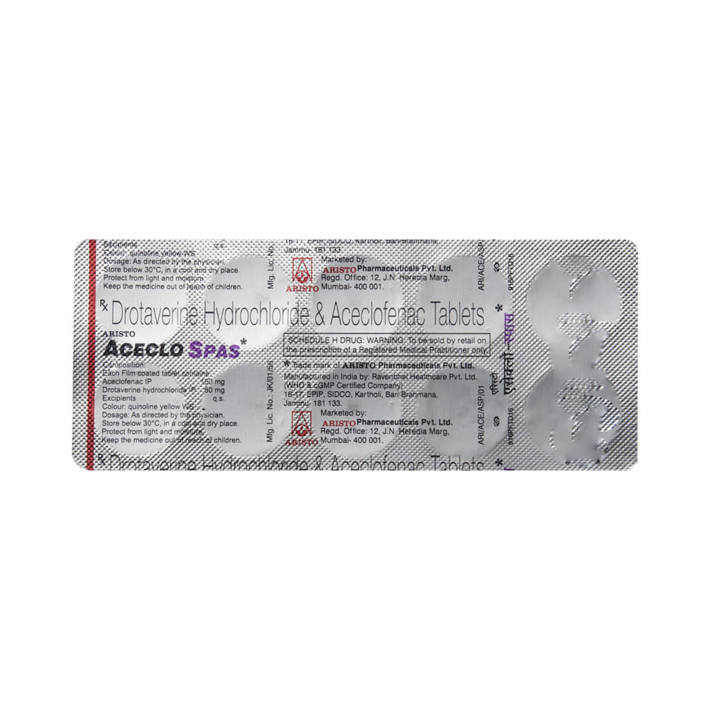 aceclo SPAS Tablet is a combination of two medicines: Drotaverine and Aceclofenac, which relieves abdominal pain and cramps. Drotaverine is an anti-spasmodic medicine which relieves contractions (spasms) associated with smooth muscles in the abdomen. Aceclofenac is a non-steroidal anti-inflammatory drug (NSAID). It works by blocking the release of certain chemical messengers that cause abdominal pain and inflammation (swelling).