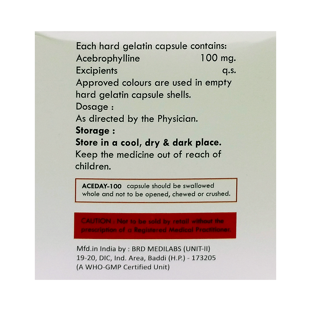 Aceday 100 Capsule is used to treat and prevent symptoms of asthma, bronchitis, and chronic obstructive pulmonary disorder (a lung disorder in which airflow to the lung is blocked). It helps relax the muscles of the air passages, thus widening them and making them easier to breathe. Aceday 100 Capsule can be taken with the food in the evening. Take it at the same time every day to get the most benefit. The dose and how often you take it depends on what you take it for. Your doctor will decide how much you need to improve your symptoms. Take this medicine for as long as it is prescribed for you. Do not miss even a single dose. If missed, take it as soon as you remember, or skip the missed dose and continue with regular dosing if it's almost time for the next dose. It does not work immediately or prevent the already-started breathing trouble; hence, always carry your medical inhaler for an emergency.The most common side effects of this medicine include abdominal discomfort, abdominal distension, vomiting, abdominal pain, diarrhea, constipation, and heartburn. If these bother you or appear serious, let your doctor know. There may be ways of reducing or preventing them. Generally, it is advised not to consume alcohol or do not smoke while on treatment.Before taking this medicine, tell your doctor if you have kidney, liver, or heart-related disease. Your doctor should also know about all other medicines you are taking, as many may make this medicine less effective or change its effect. Before starting the treatment, inform your doctor if you are pregnant or breastfeeding.