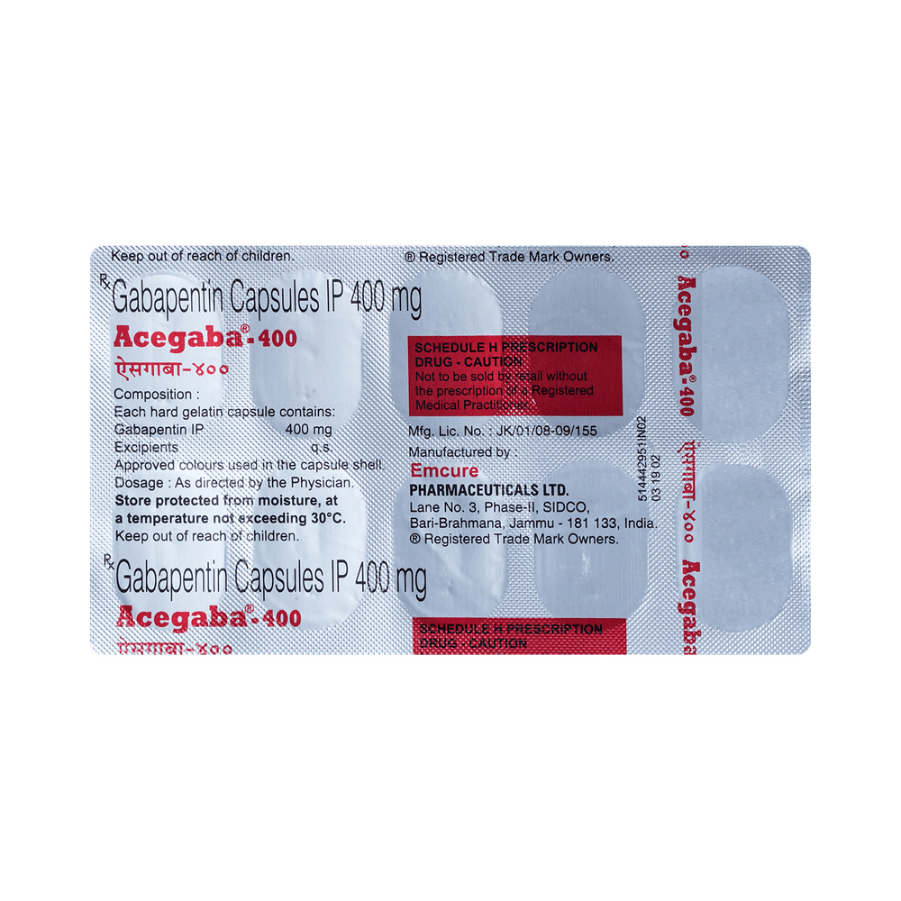 Acegaba 400 Capsule is a medicine used to relieve the pain caused by nerve damage (neuropathic pain) due to various conditions like diabetes, shingles (herpes zoster infection), spinal cord injury, etc. It is also used to treat certain types of seizures (fits) in combination with other medicines. Acegaba 400 Capsule belongs to the anti-epileptic group of medicines. You may take it with or without food, but it is important to take this medicine at the same time each day to get the most benefit. The exact dose and duration of treatment will depend on your condition and how you respond to it. Your doctor will probably start this medicine at a low dose and increase it gradually. It may take a few weeks for the medicine to work properly. Follow your doctor’s instructions and continue taking it regularly until your doctor advises you to stop. Do not miss any dose, otherwise, your condition may worsen.Most people taking Acegaba 400 Capsule do not experience any side effects. The most common ones are feeling sleepy, dizzy, or tired (fatigue). These are usually mild and go away by themselves as your body gets used to the medicine. Most side effects are not serious and do not need medical attention. Talk to your doctor if any of the side effects persist or worry you.You should avoid drinking alcohol along with this medicine as it may lead to excessive sleepiness and dizziness. Let your doctor know right away if you develop any unusual mood changes like anxiety, agitation, depression, or thoughts about harming yourself.Before taking Acegaba 400 Capsule, you should tell your doctor if you have any kidney-related problems or if you are more than 65 years old. Your doctor may prescribe a different dose in such people. Women who are pregnant, breastfeeding, or planning to become pregnant should also consult their doctor before using this medicine.