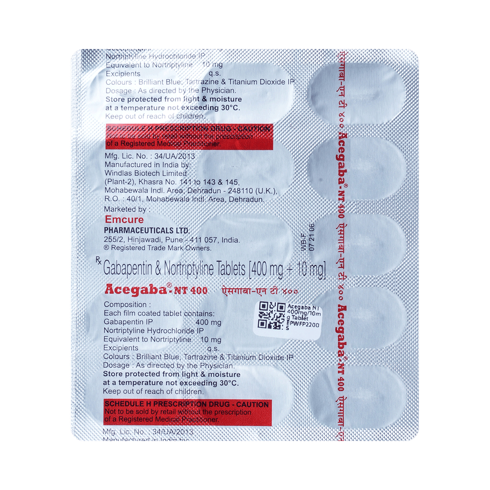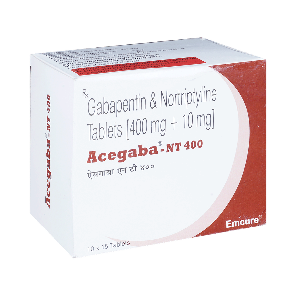 Acegaba NT 400mg/10mg Tablet is a combination medicine used for the treatment of neuropathic pain. This medicine decreases the pain by stopping the movement of pain signals to the brain. Acegaba NT 400mg/10mg Tablet is taken by mouth, with or without food and preferably at night. It is advised to take it at a fixed time each day to maintain a consistent level of medicine in the blood. In case you miss a dose of this medicine, take it as soon as you remember. Finish the full course of treatment even if you feel better. It is important not to stop taking this medicine suddenly without talking to the doctor as it may worsen your symptoms.Some common side effects of this medicine constipation, difficulty in urination, weight gain, tiredness, and dryness in mouth. It may also cause dizziness and sleepiness, so do not drive or do anything that requires mental focus until you know how this medicine affects you. This medicine may cause weight gain and to control it, you should exercise regularly and take a balanced diet. Remember to inform the doctor if you develop any unusual changes in mood as this medicine may lead to suicidal thoughts.Before taking this medicine let your doctor know if you suffer from kidney or liver disease. Your doctor should also know about all other medicines you are taking as many of these may make this medicine less effective or change the way it works. Inform your doctor if you are pregnant, planning pregnancy or breastfeeding.