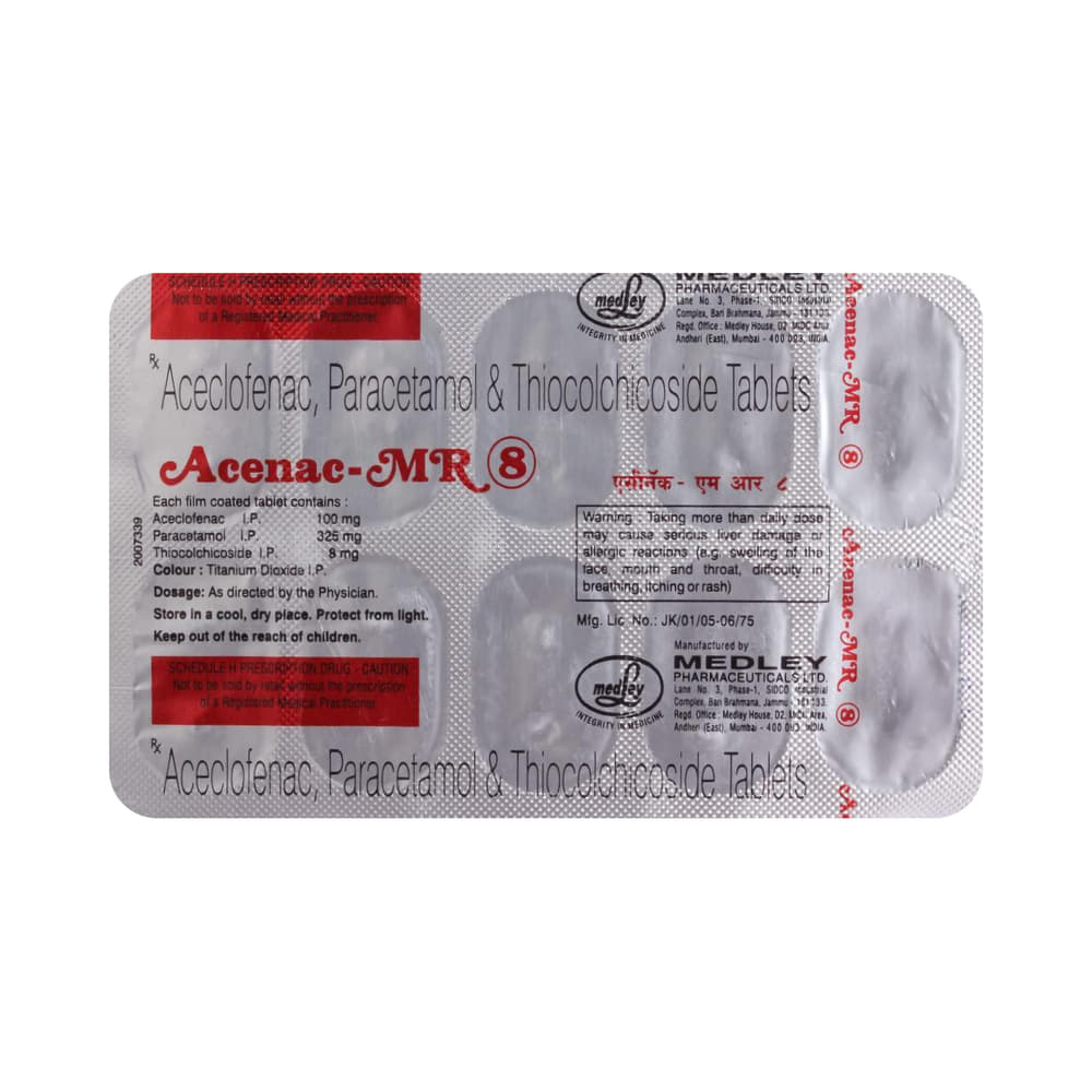 ACEnac-MR 8mg/100mg/325mg Tablet is a combination medicine that helps in relieving muscular pain. It works by blocking the release of certain chemical messengers that cause pain, inflammation, and fever. This improves the movement of muscles and provides relief from pain and discomfort. ACEnac-MR 8mg/100mg/325mg Tablet should be taken with food. This will prevent you from getting an upset stomach. The dose and duration will depend on the severity of your condition. You should keep taking the medicine even if you feel better until the doctor says it is alright to stop using it.Using this medicine may cause few common side effects such as nausea, vomiting, heartburn, stomach pain, diarrhea, loss of appetite, and dryness in the mouth. If any of these side effects do not resolve with time or get worse, you should let your doctor know. Your doctor may be able to suggest ways of preventing or reducing the side effects. In general, you should try to use the smallest amount necessary to control your symptoms.Before using the medicine, you should tell your doctor if you have any other medical conditions or disorders. To make sure it is safe, you should let your doctor know all the other medicines you are taking. Also, tell your doctor if you have any problems with your liver or kidneys. You should avoid the consumption of alcohol while on treatment with this medicine. Pregnant and breastfeeding women should consult their doctors first before using the medicine.