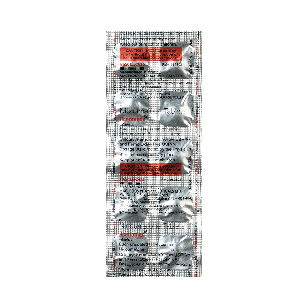 Acenomac 4mg Tablet is an oral anticoagulant that helps prevent harmful blood clots in the legs, lungs, brain, and heart. It is used for deep vein thrombosis, pulmonary embolism, and stroke prevention. Acenomac 4mg Tablet should be taken as advised by the doctor. You may take it with or without food, but it is better to take it at a fixed time. This medicine should not be stopped abruptly without consulting the doctor. You should take this medicine regularly to get the most benefit, even if you feel fine. It prevents future harm.The most common side effect of Acenomac 4mg Tablet is bleeding. Let your doctor know immediately if you see a pinpoint rash or blood in your vomit, urine, or stool. If you are going under any surgery or dental treatment, you may need to stop this medicine for some time, but only after consulting with your doctor.Before taking Acenomac 4mg Tablet, you must inform the doctor if you are suffering from any kidney or liver disease or taking any medicine, including supplements and herbal products. Also, let your doctor know if you are pregnant or breastfeeding and about all the other medications that you are taking regularly.