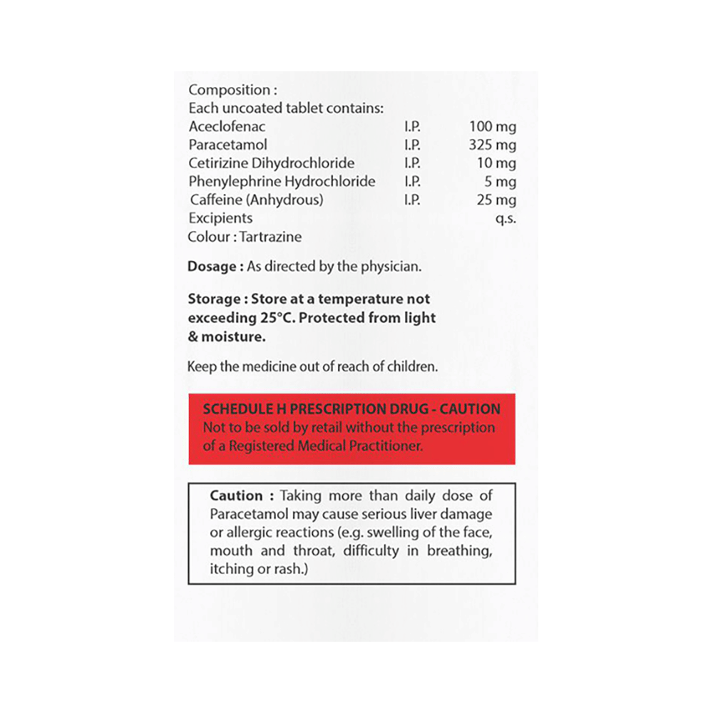 Salt Composition: Aceclofenac (100mg) + Paracetamol (325mg) + Cetirizine (10mg) + Phenylephrine (5mg) + Caffeine (25mg)