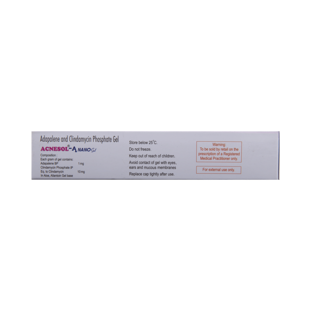 Acnesol A Nano Gel is a combination of two medicines used in the treatment of acne. It minimizes oil production and helps to reduce inflammation. It also kills acne-causing microorganisms and prevents infection. This helps prevent pimples, blackheads, and whiteheads on the skin. Acnesol A Nano Gel is only meant for external use and should be used as advised by your doctor. You should normally wash and dry the affected area before applying a thin layer of the medicine. It should not be applied to broken or damaged skin.Avoid any contact with your eyes, nose, or mouth. Rinse it off with water if you accidentally get it in these areas. It may take several weeks for your symptoms to improve, but you should keep using this medicine regularly. Do not stop using it as soon as your acne starts to get better. Ask your doctor when you should stop treatment.Side effects like minor itching, burning, or redness of the skin, and oily skin may be seen in some people. These are usually temporary and resolve on their own. Consult your doctor if they bother you or do not go away.Inform your doctor if you have any problems with your bowels (intestines) or if you are using any other medicines to treat skin conditions. Consult your doctor about using this medicine if you are pregnant or breastfeeding.