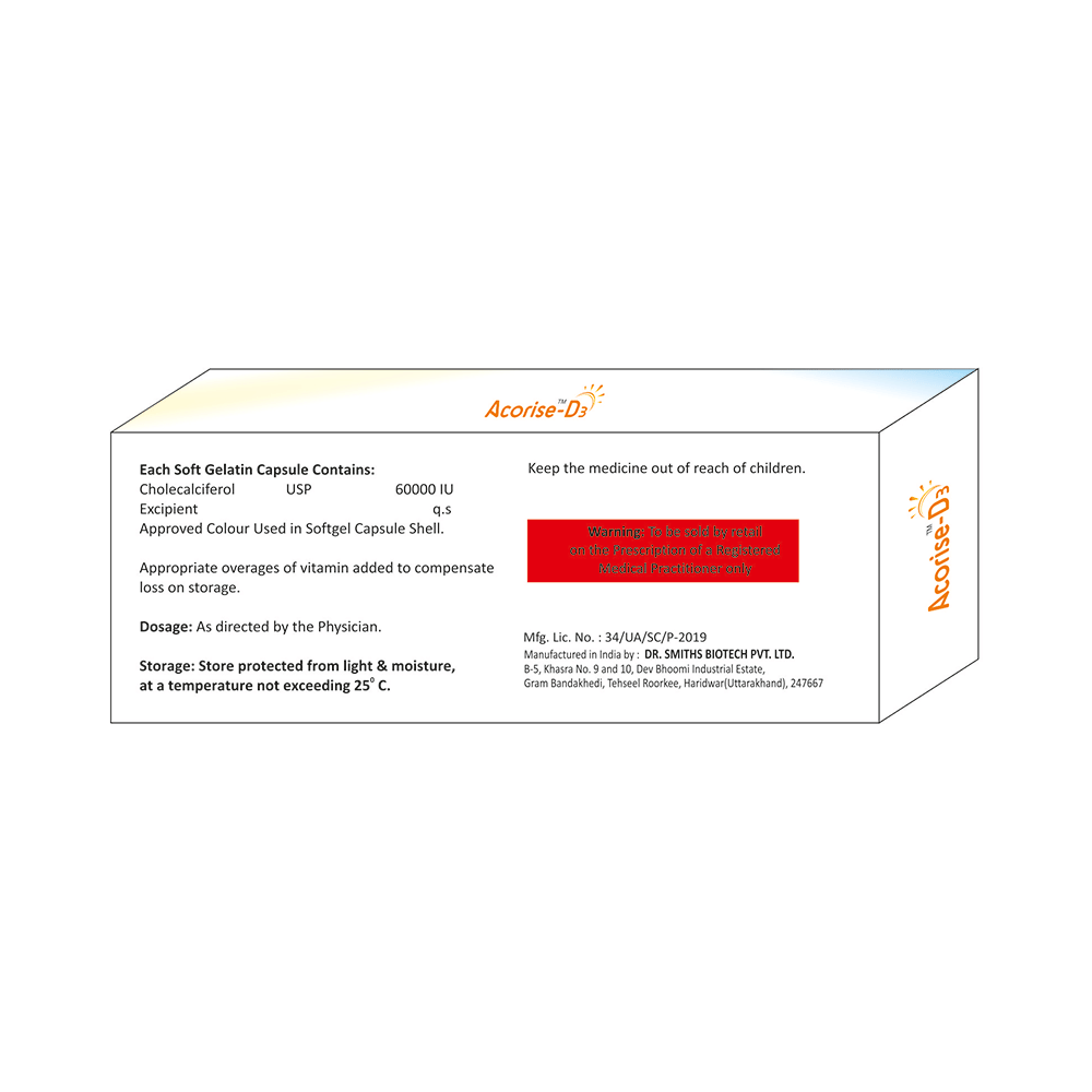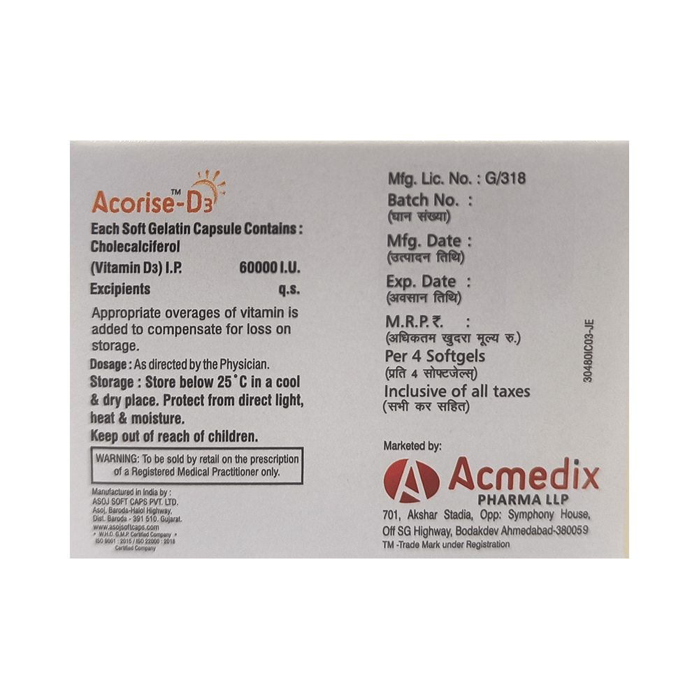 Acorise-D3 Softgel Capsule is a form of vitamin D. It raises vitamin D levels in your blood. This, in turn, increases calcium levels in your blood by helping you absorb more calcium from food.