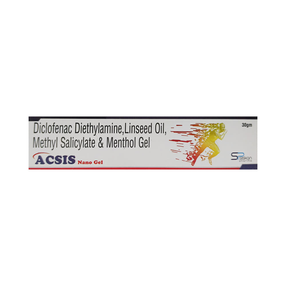 Acsis Nano Gel is a combination medicine used topically to relieve pain. It works by blocking the release of certain chemical messengers that cause pain and inflammation. It also improves blood circulation at the site of application as well as produces a cooling effect on the skin. Acsis Nano Gel is for external use only. Use it in the exact dose and duration prescribed by your doctor. Do not use more than the prescribed amount as it might increase the side effects. Check the label for directions before use. Clean and dry the affected area and apply the gel. Wash your hands thoroughly before and after applying the medicine, unless hands are the affected area.On application, it may cause burning, irritation, itching, and redness at the site of application. If any of these do not subside on its own or get worse, let your doctor know. They may be able to suggest ways of preventing or reducing the side effects. Before taking the medicine always consult your doctor if you are pregnant, breastfeeding, or if you have any medical conditions. Let your doctor also know if you are using any other medicines.