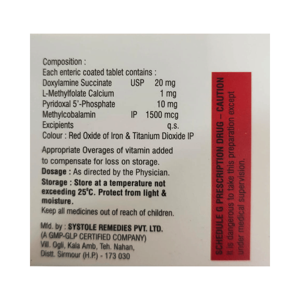 Salt Composition: Doxylamine (20mg) + Vitamin B6 (Pyridoxine) (10mg) + L-Methyl Folate Calcium (1mg) + Methylcobalamin (1500mcg)