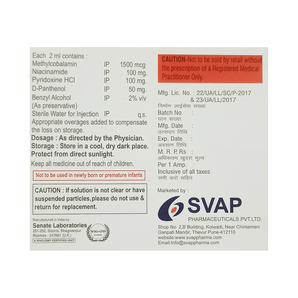 Salt Composition: Methylcobalamin (1500mcg/2ml) + Vitamin B6 (Pyridoxine) (100mg/2ml) + Niacinamide (100mg/2ml) + D-Panthenol (50mg/2ml)