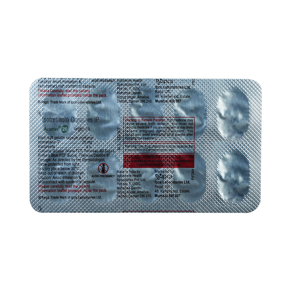 aCUTRet 20 Capsule belongs to a group of medicines called retinoids (vitamin A derivative). It is used to treat severe acne that has not responded to other treatments. aCUTRet 20 Capsule should be used in the dose and duration as advised by your doctor. Take it with food, preferably at the same time each day to avoid a missed dose. It may take several weeks for your symptoms to improve but keep taking the medicine regularly to get the most benefit. If you notice no improvement after a few weeks, see your doctor again.The most common side effects include dry skin, rash, and increased liver enzymes. They are not usually serious and often disappear after getting used to the medicine but if they bother you or do not go away, tell your doctor.aCUTRet 20 Capsule may make you more sensitive to sunlight so you should limit your exposure to the sun. It may also make your skin more fragile. Avoid any waxing (hair removal), or laser treatments during treatment. Additionally, it may cause dryness of the mouth, lips, and eyes so drink plenty of water and use a moisturizer. This medicine may lead to birth defects, do consult your doctor if you are pregnant or planning pregnancy.