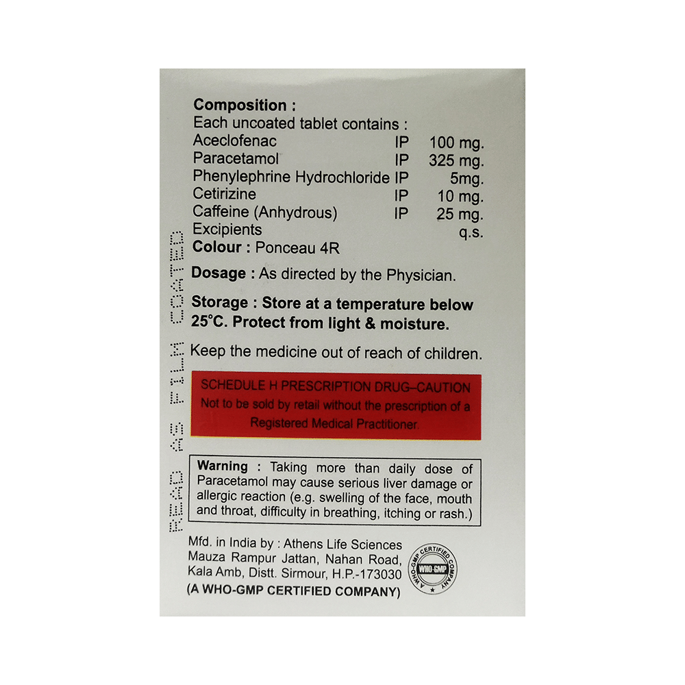 Salt Composition: Aceclofenac (100mg) + Paracetamol (325mg) + Cetirizine (10mg) + Phenylephrine (5mg) + Caffeine (25mg)