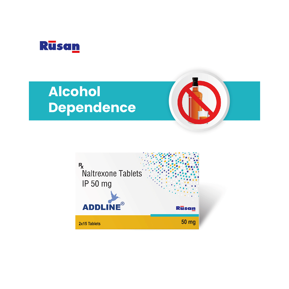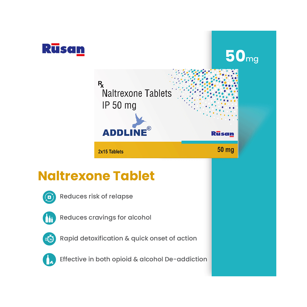 Addline Tablet is used in the treatment of opioid dependence and alcohol addiction. It works by blocking the euphoric feelings (highs) that Some people may experience after taking opiates and alcohol. This reduces the craving and helps you stay away from them. Addline Tablet may be taken with or without food. Take it regularly at a fixed time each day to get the maximum benefit of the medicine. Continue taking the medicine for as long as the doctor has prescribed it. DO not stop taking the medicine until you have finished the full course. Common side effects of this medicine include nausea, vomiting, headache, nervousness, anxiety, sleep disorders, restlessness, abdominal pain, joint pain, muscle pain, and weakness. Do not drive or operate machinery after taking the medicine as you may feel dizzy or tired.