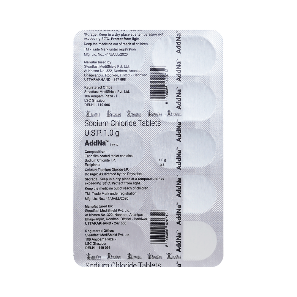 Addna Tablet is a purified salt solution that works by replenishing salt and electrolyte levels in the body.