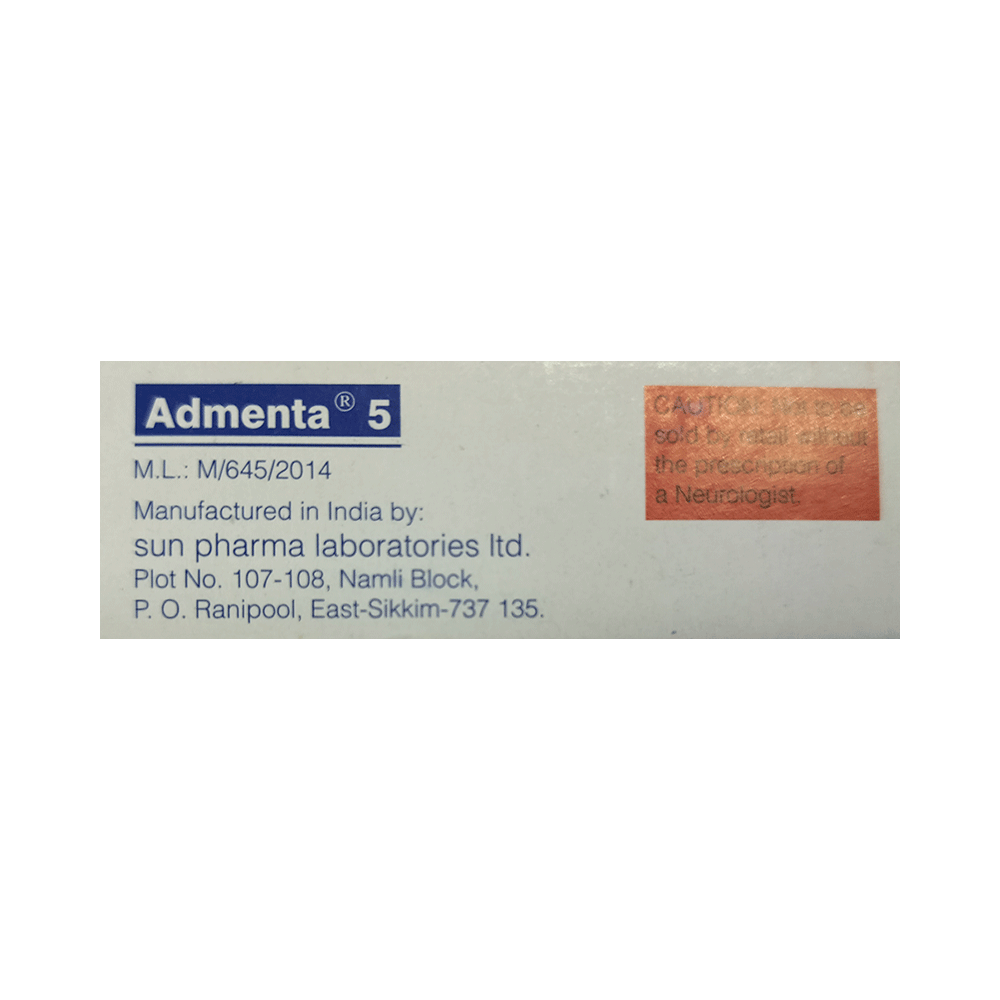 ADMenta 5 Tablet is a medicine used in the treatment of Alzheimer's disease. It helps to slow down the progression of moderate to severe Alzheimer's disease by improving memory and thinking. This medicine works by blocking a chemical messenger involved in the transmission of nerve signals. ADMenta 5 Tablet maybe taken with or without food. However, it is advised to take it at the same time each day to maintain a consistent level of medicine in the blood. If you missed a dose, take it as soon as you remember. Do not skip any doses and finish the full course of treatment even if you feel better. It is important that this medication is not stopped suddenly without talking to your doctor.The most common side effects of this medicine are dizziness, headache, confusion, and constipation. It may also cause dizziness and sleepiness, so do not drive or do anything that requires mental focus until you know how this medicine affects you.Before taking this medicine, inform the doctor if you have a history of seizures, kidney disease, heart disease, or liver disease. Let your doctor also know if you are taking any other medicines for any medical conditions. Pregnant and breastfeeding women should consult their doctors before taking this medicine.