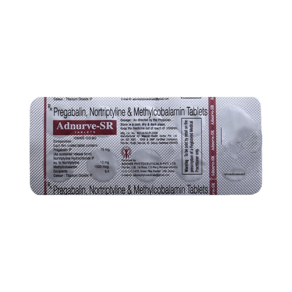 Adnurve SR Tablet is a combination of three medicines: Pregabalin, Nortriptyline and Methylcobalamin. Pregabalin is an alpha 2 delta ligand which decreases pain by modulating calcium channel activity of the nerve cells. Nortriptyline is a tricyclic antidepressant which increases the levels of chemical messengers (serotonin and noradrenaline) that stop the movement of pain signals in the brain. Methylcobalamin is a form of vitamin B which helps in the production of myelin, a substance that protects nerve fibers and rejuvenates damaged nerve cells. Together, they relieve neuropathic pain (pain from damaged nerves).