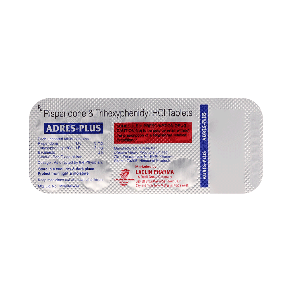 Adres-Plus Tablet is a combination of two medicines: Risperidone and Trihexyphenidyl. Risperidone is an atypical antipsychotic that works by balancing the levels of chemical messengers (dopamine and serotonin) to improve mood, thoughts, and behavior. Trihexyphenidyl is an anticholinergic that works on the nervous system and corrects some of the chemical imbalances that cause Parkinson's disease and certain side effects occurring during antipsychotic treatment.