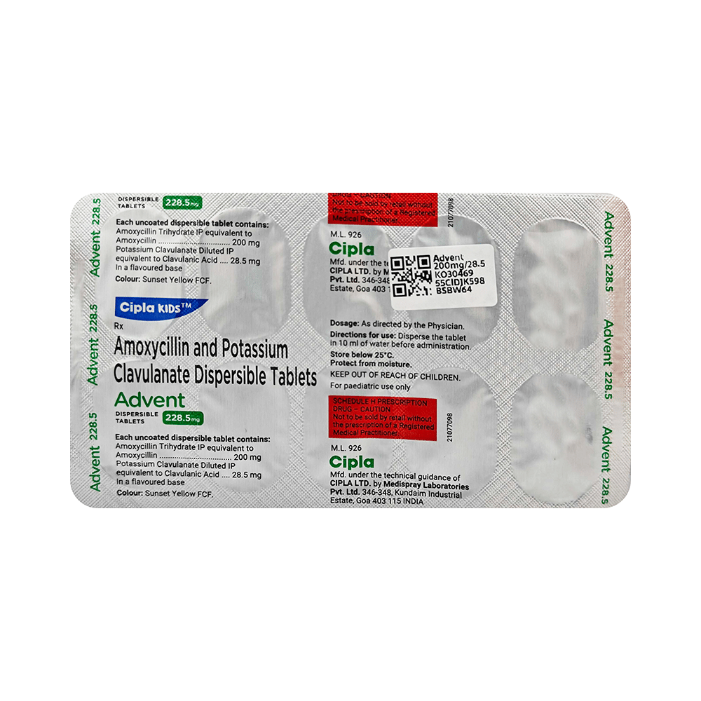 Advent 200mg/28.5mg Tablet DT is an antibiotic medicine that helps treat bacterial infections of the ear, nose, throat, chest, lungs, teeth, skin, and urinary tract. It is capable of killing bacteria that have become resistant to other therapies and thus also helps treat tuberculosis that is resistant to other treatments. You can give Advent 200mg/28.5mg Tablet DT to your child with or without food. It is better to give it with food as that helps increase absorption and decrease the risk of stomach upset. The doctor may prescribe giving it two to three times a day. Medicine dose depends on the severity of the infection, its type, and your child’s body weight and age. So, stick to the dose, time, and way prescribed. If your child vomits the medicine within 30 minutes of intake, let the child calm down and repeat the dose. Do not double dose if it's the time for the next dose.Advent 200mg/28.5mg Tablet DT may cause vomiting, diarrhea, nausea, abdominal pain, and allergy. These side effects should diminish on their own. But, in case they persist or start bothering your child, you must not delay speaking to your child’s doctor.Share your child’s entire medical history with the doctor, including any previous episode of allergy, heart problem, a blood disorder, birth defects, airway obstruction, lung anomaly, gastrointestinal problem, skin disorder, liver impairment, and kidney malfunction. This information will assist the doctor in making dose alterations and in planning your child’s overall treatment.