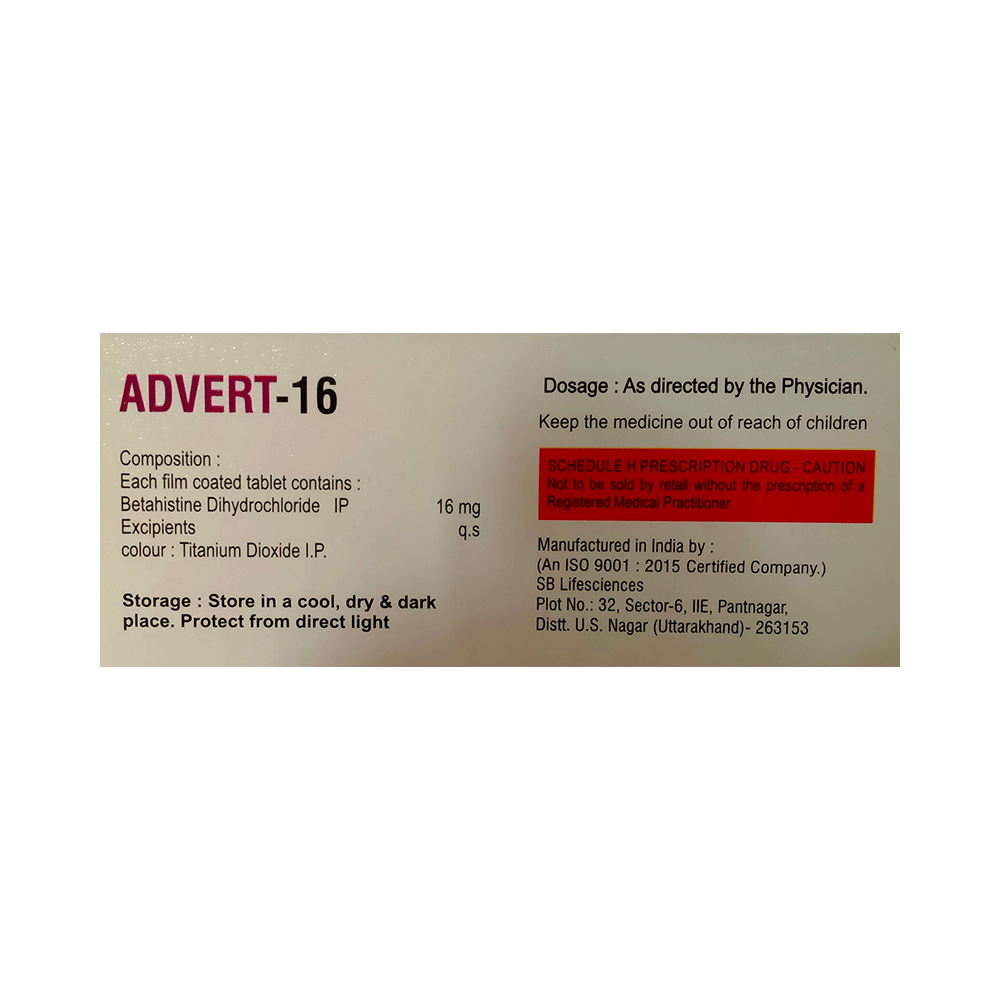 Advert 16 Tablet is used to prevent and treat a disorder of the inner ear known as Ménière’s disease. The symptoms include dizziness (vertigo), ringing in the ears (tinnitus), and loss of hearing, probably caused by fluid in the ear. This medicine helps relieve the symptoms by reducing the amount of fluid. Advert 16 Tablet should be swallowed whole with water and taken at the same time(s) each day to get the most benefit. Your doctor will decide what is the correct dose to relieve your symptoms and how often you need to take it. You may need to take this medicine for several months and you should take it for as long as prescribed by your doctor, even if you start feeling better. The most common side effects include headache, feeling sick, and indigestion (dyspepsia). You may also get stomach pain and bloating. Taking the medicine with food can help reduce stomach problems.  Before taking this medicine, you should talk to your doctor if you have a stomach ulcer, asthma, or high or low blood pressure. You must also tell him/her what other medicines you are taking, to make sure you are safe. Also speak to your doctor if you are pregnant, trying to become pregnant, or breastfeeding.
