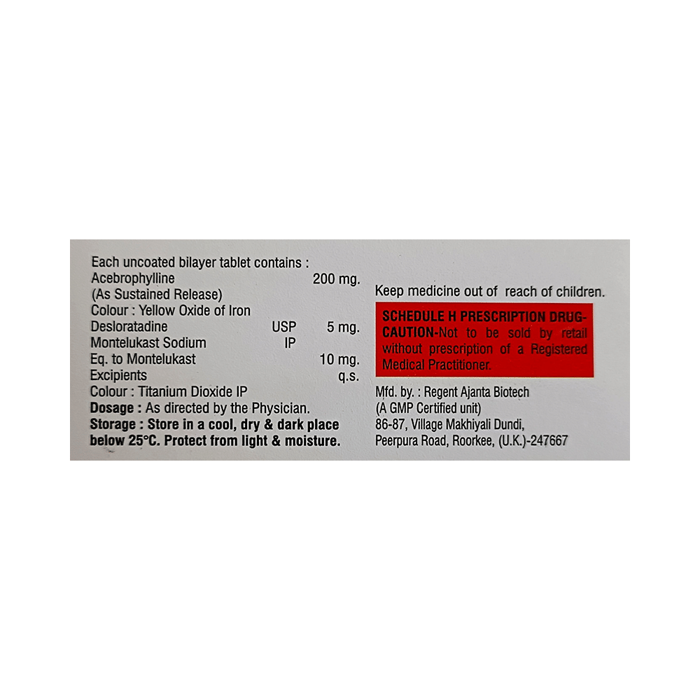 Salt Composition: Acebrophylline (200mg) + Desloratadine (5mg) + Montelukast (10mg)