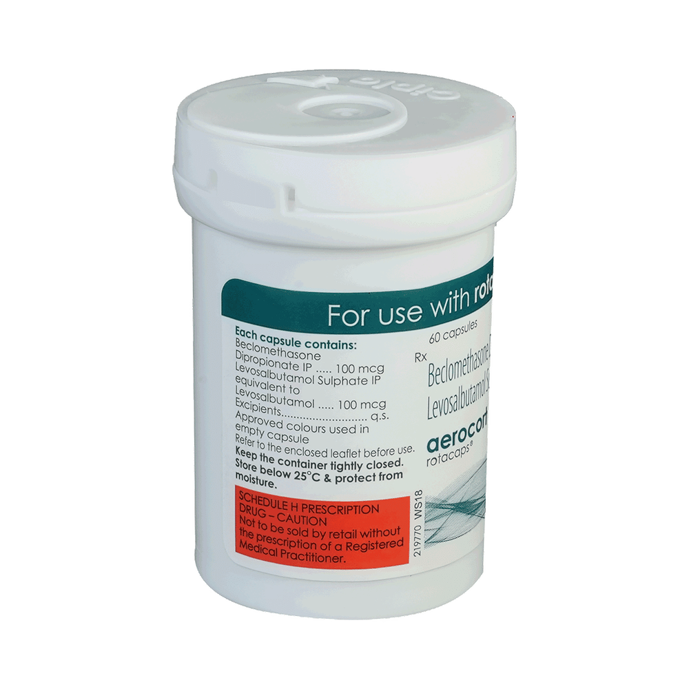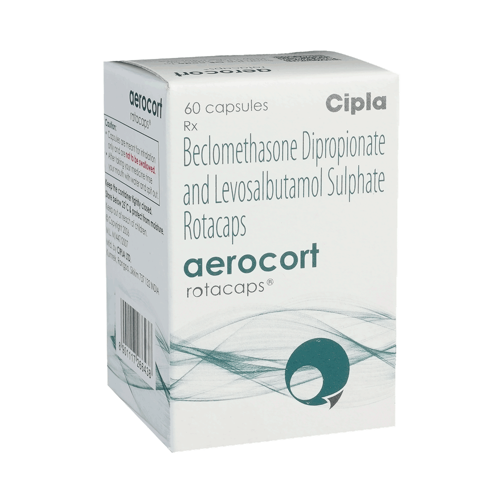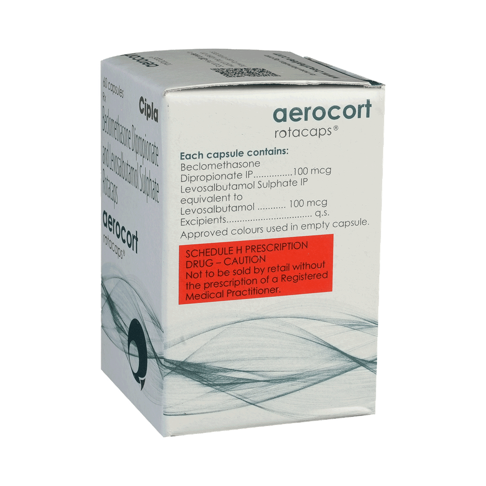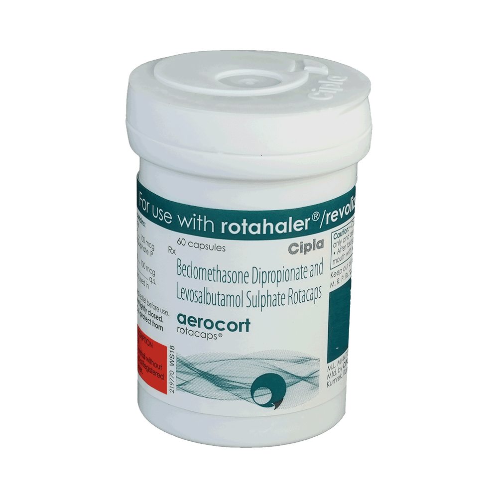Aerocort Rotacap is a combination of two medicines: Levosalbutamol and Beclometasone. Levosalbutamol is a bronchodilator which works by relaxing the muscles in the airways and widens the airways. Beclometasone is a steroid medicine. It acts by stopping the release of certain natural substances in body that cause inflammation (swelling) of the airways. Together, they make breathing easier.