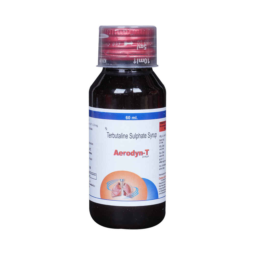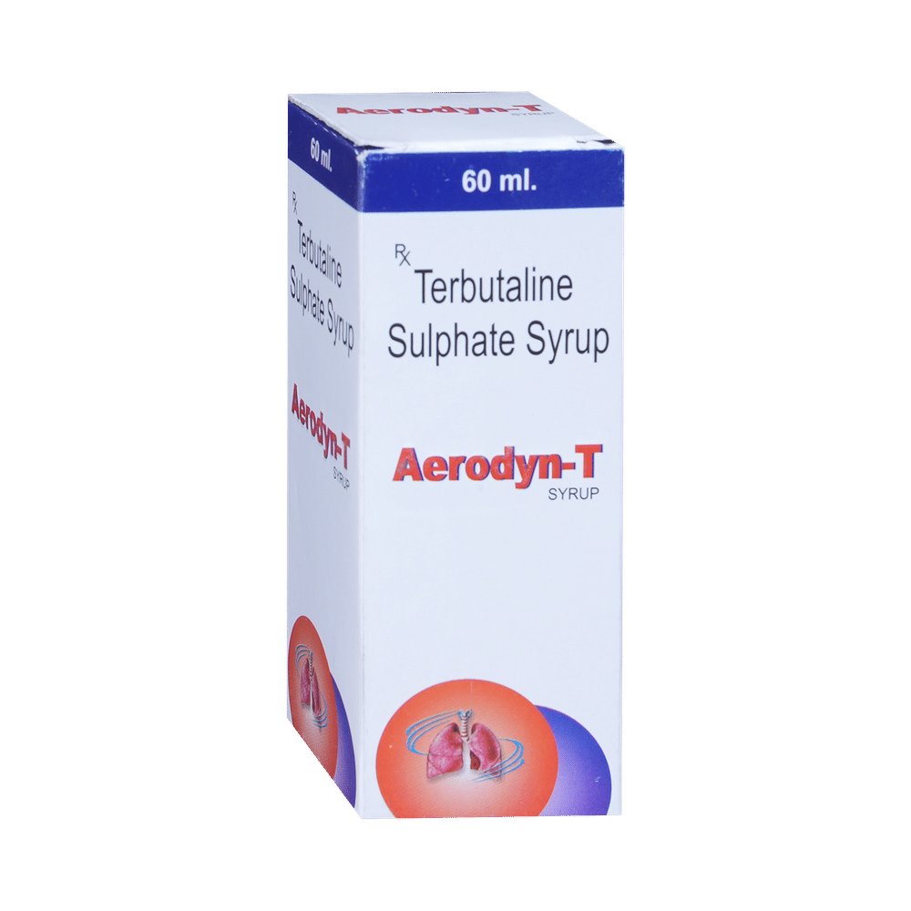 Aerodyn-T Syrup is used to relieve symptoms of asthma and chronic obstructive pulmonary disease (COPD) such as coughing, wheezing and breathlessness. It helps in relaxing the muscles of the air passages, thus widening it and making it easier to breathe. You can take Aerodyn-T Syrup with or without food. The dose will depend on your condition and how you respond to the medicine. Try to take it at the same time each day. It is important to keep taking this medicine until your doctor tells you not to. Use this medicine regularly to get the most benefit from it even if you feel well.Aerodyn-T Syrup is generally safe with little or no side effects. However, it may cause headache, fast heart rate, trembling, or muscle cramps in some people. These side effects are not often dangerous and should gradually improve as your body gets used to this medicine. There are other, rarer, side effects and you should call your doctor straight away if you get chest pain, a very bad headache, or very bad dizziness.Before using Aerodyn-T Syrupl, you should tell your doctor if you have high blood pressure, an overactive thyroid gland, a history of heart problems, diabetes, or low levels of potassium in your blood to make sure it is safe. Also, make sure your doctor knows if you are pregnant or breastfeeding before taking this medicine. Because this medicine can make you feel dizzy or shaky, do not drive, cycle, or use tools or machinery until you feel better. You should not smoke as it causes damage to your lungs and will make your condition worse.