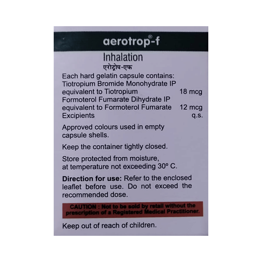 Aerotrop-F Capsule is used to treat chronic obstructive pulmonary disorder (a lung disorder in which the flow of air to the lungs is blocked). It helps in relaxing the muscles of the air passages and making it easier to breathe. It relieves coughing, wheezing, and shortness of breath. Your doctor will tell you how often you need to use your Aerotrop-F Capsule. The effect of this medicine may be noticeable after a few days, but will only reach its maximum after a few weeks. This medicine must be used regularly to be effective, so go on taking it even if you don't have any symptoms. If you stop taking it, your COPD may get worse. To get the benefit from this medicine, you need to make sure you get your inhaler technique right, otherwise, it does not work well.The most common side effects of Aerotrop-F Capsule are nausea, diarrhea, dry mouth, vomiting, dizziness, nasopharyngitis (inflammation of the throat and nasal passages), and insomnia. If you experience any of these symptoms, don’t stop taking it, but do talk to your doctor. You can prevent some of these symptoms by rinsing your mouth and throat with water or brushing your teeth after using your inhaler. If you experience any other symptoms and you are worried about them, consult your doctor.Before taking this medicine, you should tell your doctor if you are pregnant, planning pregnancy, or breastfeeding.