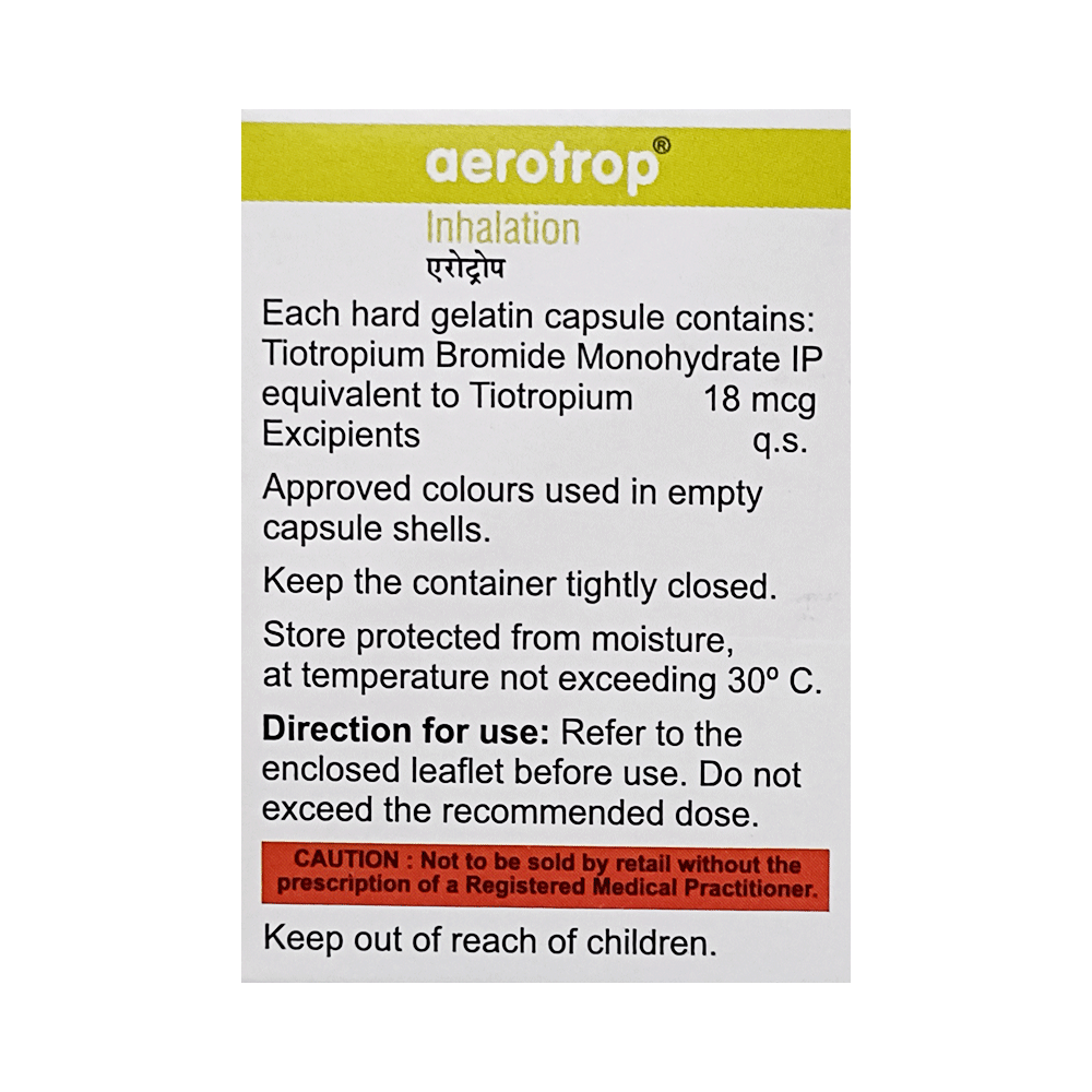 Aerotrop Inhalation is an anticholinergic medicine. It is used in the treatment of chronic obstructive pulmonary disease and asthma. It relaxes the airway muscles and makes it easier to breathe. This helps relieve symptoms such as chest tightness, shortness of breath, wheezing, and coughing. Aerotrop Inhalation is only for inhalational purpose, use it in the dose and duration as prescribed by your doctor. The first dose is given under medical supervision to prevent the side effects happen during first use. For better results, it is suggested to take it at the same time every day. The dose and how often you take it depends on what you are taking it for. Your doctor will decide how much you need to improve your symptoms. You should take this medicine for as long as it is prescribed for you. It does not prevent the already started breathing trouble or asthma attack, hence always carry your medical inhaler with you for an emergency.The most common side effect of this medicine is dry mouth. If these bother you or appear serious, let your doctor know. To overcome dry mouth, it is advised to increase water intake, carry sugar candy, or maintain good oral hygiene. If you experience any other side effects, let your doctor know.Before taking this medicine, let your doctor know if you have liver or kidney disease, or if you are pregnant or breastfeeding. Your doctor should also know about all other medicines you are taking as many of these may make this medicine less effective or change the way it works.
