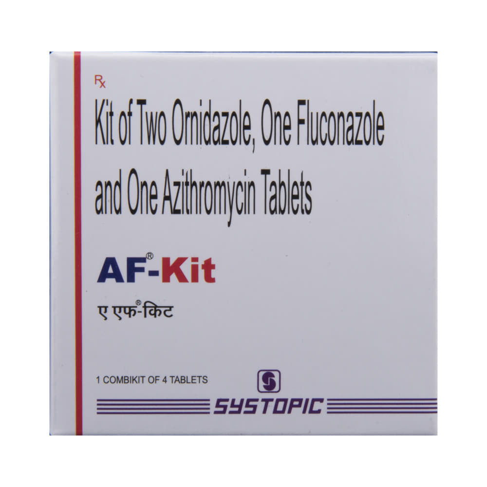 AF Kit Tablet is a combination medicine used in the syndromic management of vaginal discharge. It works by stopping the growth of microorganisms and killing the existing ones that cause the infection. It is advisable to take AF Kit Tablet at a fixed time each day to maintain consistent levels of the medicine in the blood. In case you have missed any doses, take it as soon as you remember it. Never skip any doses and finish a full course of treatment even if you feel better. It is important that this medication is not stopped without talking to the doctor as it may worsen your symptoms.It may cause side effects like nausea, headache, vomiting, taste change, dizziness, indigestion, loss of appetite, and stomach pain. It may cause diarrhea, so it is better to take plenty of fluids while taking this medicine as it may help to prevent dehydration.Before you use this medicine, let your doctor know if you have any preexisting medical conditions or if you are taking any other medicines. Let your doctor also know if you have a known allergy to any of the ingredients of this medicine. Pregnant and breastfeeding women should ask the advice of their doctor before using this medicine.