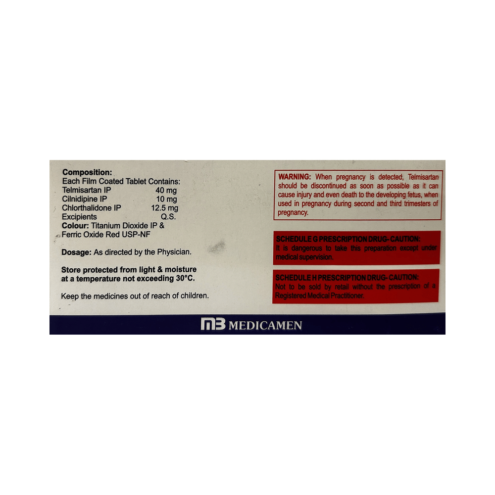 Salt Composition: Telmisartan (40mg) + Cilnidipine (10mg) + Chlorthalidone (12.5mg)